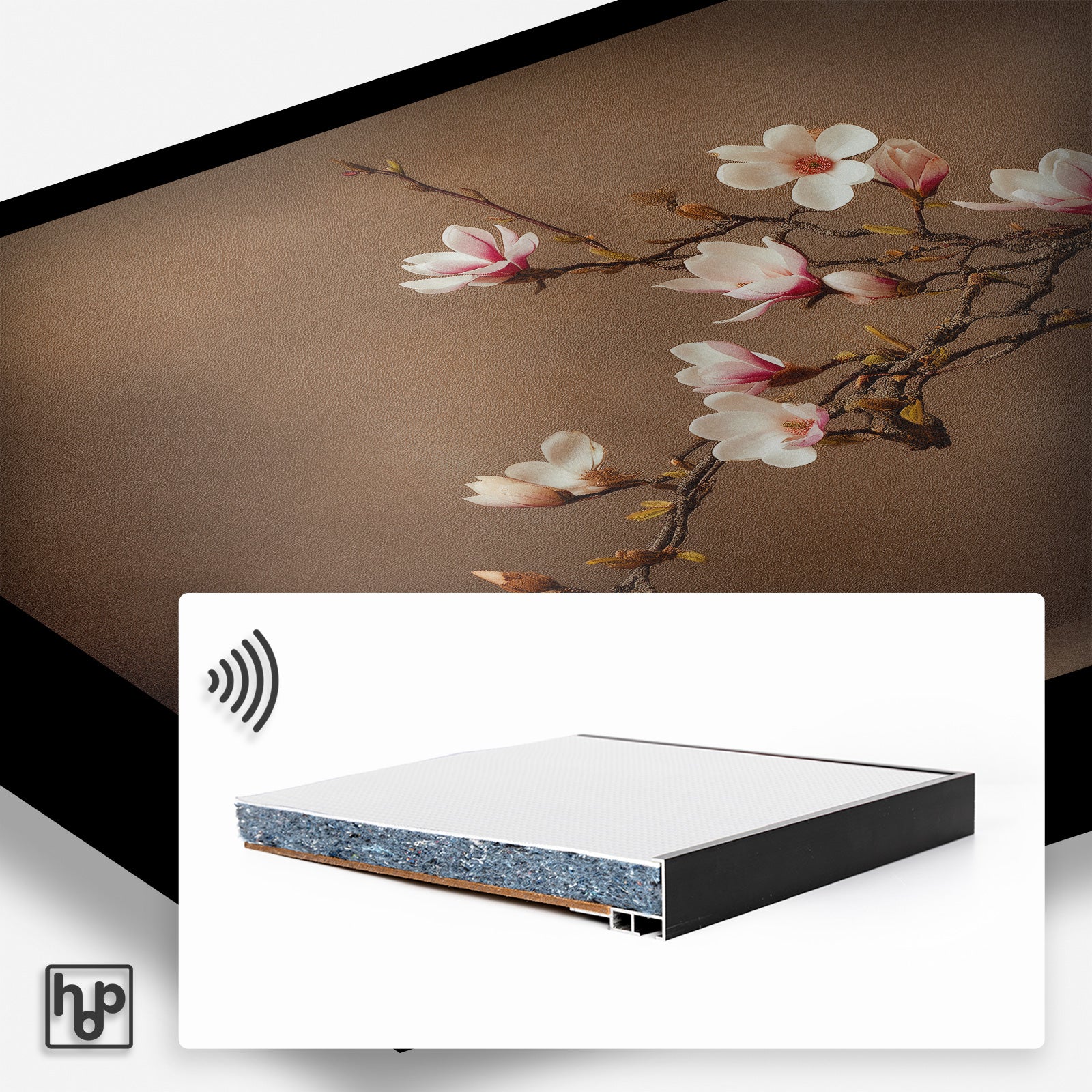 Een akoestisch paneel absorbeert geluid en vermindert galm in de ruimte. Het paneel bestaat uit hoogwaardig akoestisch materiaal met een print op zacht doek, strak gespannen in een aluminium lijst.