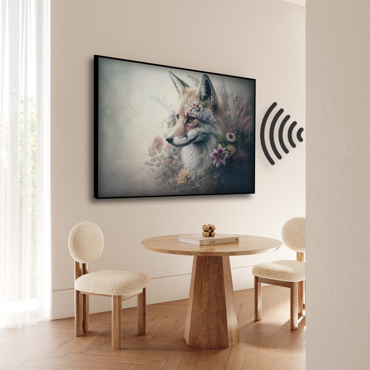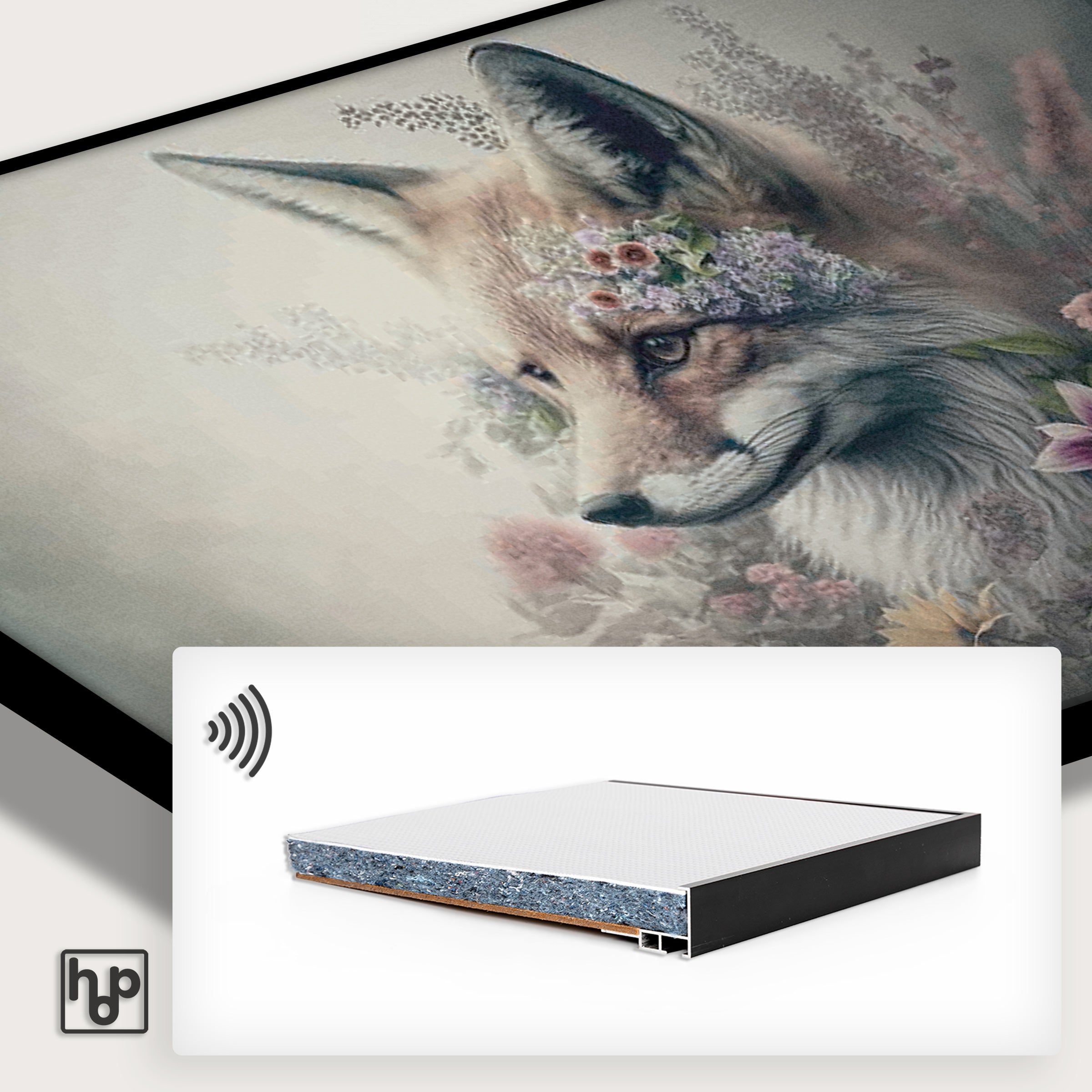 Het paneel bestaat uit hoogwaardig akoestisch materiaal met een print op zacht doek,