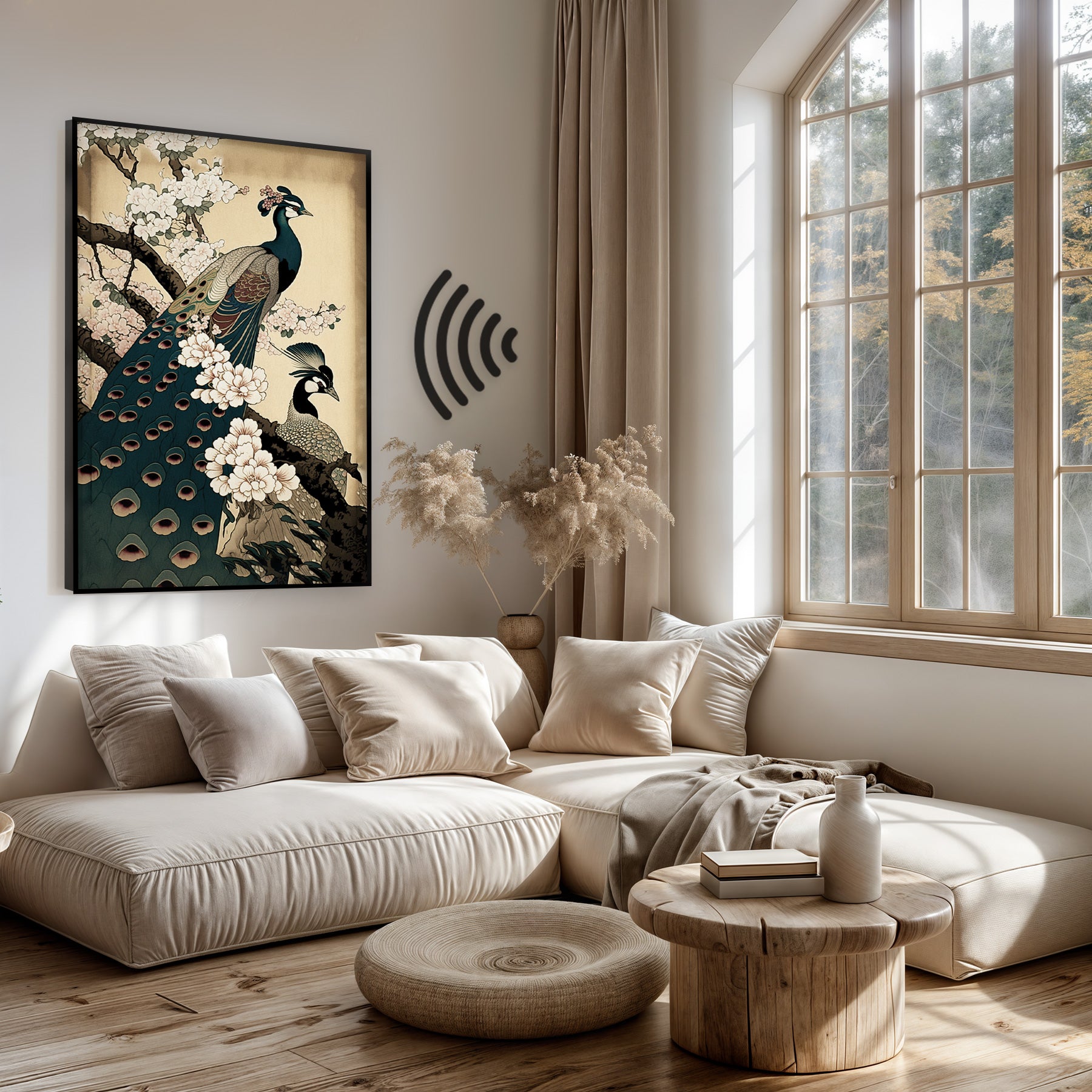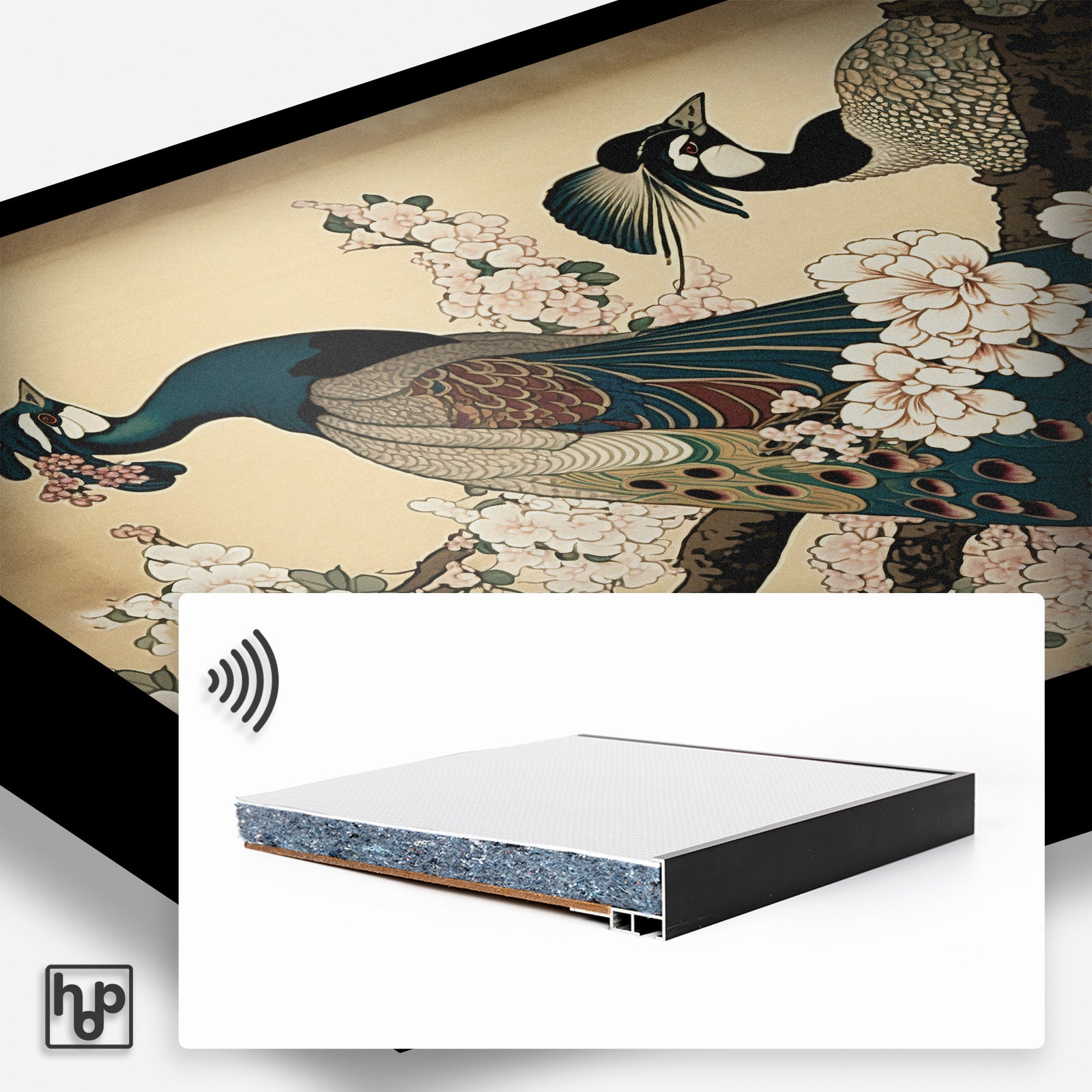 Breng rust en elegantie in huis met het Japanese Peacocks akoestisch paneel. Dit unieke kunstwerk straalt een serene sfeer uit dankzij de gracieuze pauwen en het gebruik van natuurlijke, gedempte tinten. Perfect voor momenten waarop je thuis wilt ontspannen of wanneer je een krachtige uitstraling aan je interieur wilt geven.