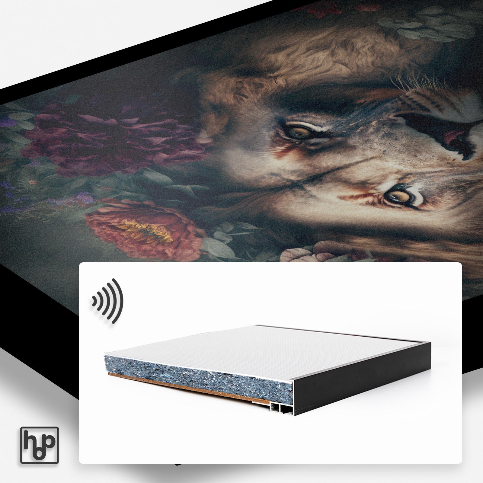 Deze akoestische wanddecoratie onderscheidt zich door de perfecte combinatie van esthetiek en functionaliteit. Het geluidsabsorberende paneel is vervaardigd van hoogwaardige materialen met een scherpe, duurzame print van het leeuwenontwerp. Zo geniet je niet alleen van een prachtige wanddecoratie, maar verbeter je ook de akoestiek in jouw ruimte. Het verschil met een standaard schilderij is duidelijk: naast visuele waarde draagt dit kunstpaneel actief bij aan het verminderen van geluidsoverlast.