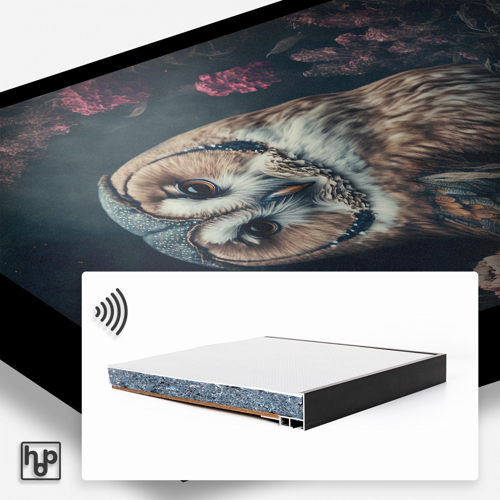 Deze akoestische wanddecoratie, met het ontwerp Owl, brengt een rustige en natuurlijke sfeer in jouw interieur. Het stijlvolle geluidsabsorberende paneel toont een verfijnde afbeelding van een uil, waardoor het een rustpunt vormt in zowel moderne als natuurlijke interieurstijlen. Door de hoogwaardige print met zachte, natuurlijke kleuren voegt deze wanddecoratie discreet comfort toe aan elke ruimte waar hij hangt.