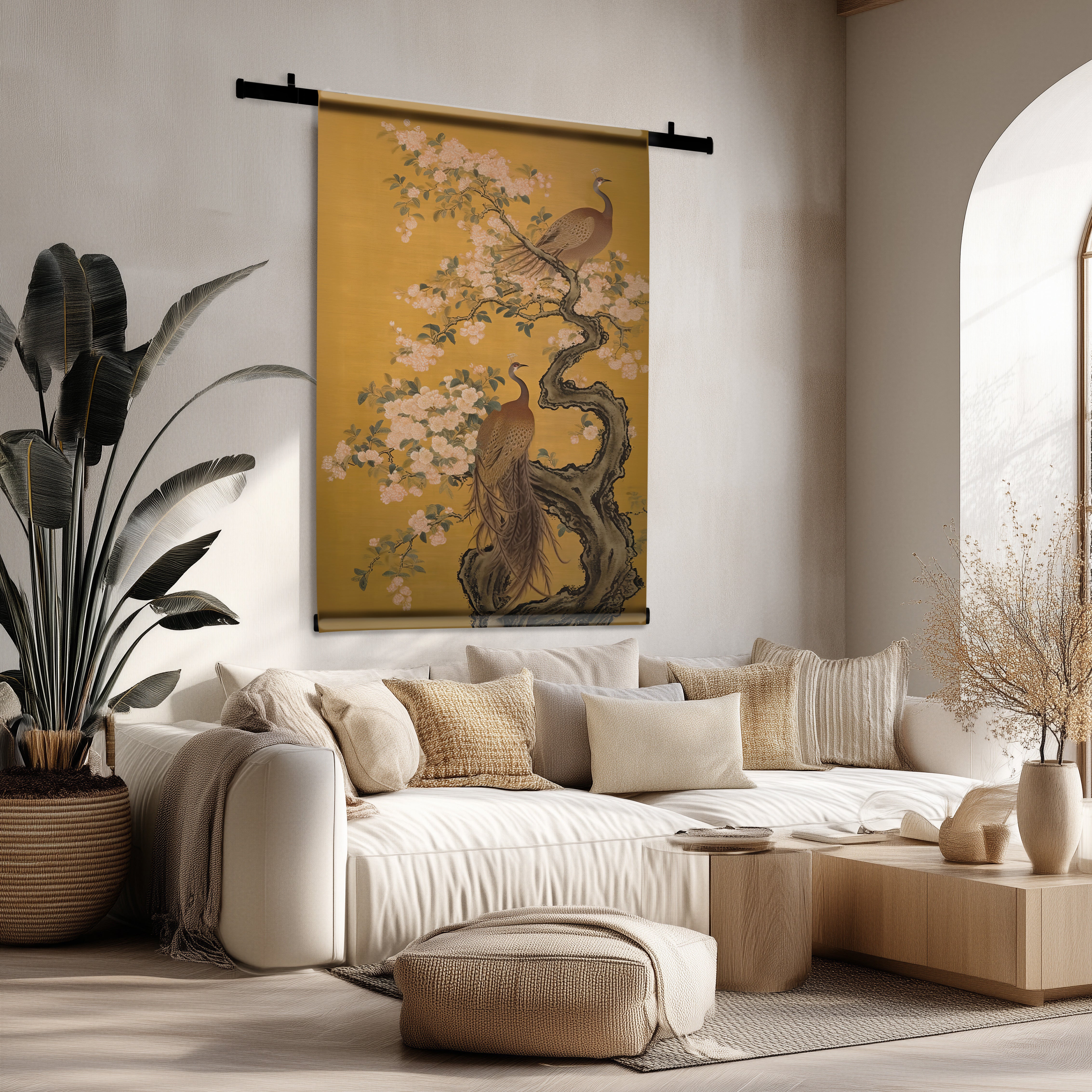 Met het afbeeldingengebied van sierlijke pauwen in Aziatische stijl voegt dit wandkleed een visueel rijke sfeer toe aan je woonkamer, slaapkamer of werkplek. Het zachte katoen krijgt een prachtig effect dankzij het fijne detail en de levendige kleuren. Je kiest zelf voor Mezo, een robuuste matte stof die een natuurlijke uitstraling geeft, of het luxe Velours met een subtiele zijdeglans. Dit kunstwerk past perfect binnen interieurs die variëren van landelijk en scandinavisch tot zen, bohemian of hotel chique. Zo wordt het een uniek stijlvol muuraccent met een harmonieuze uitstraling.