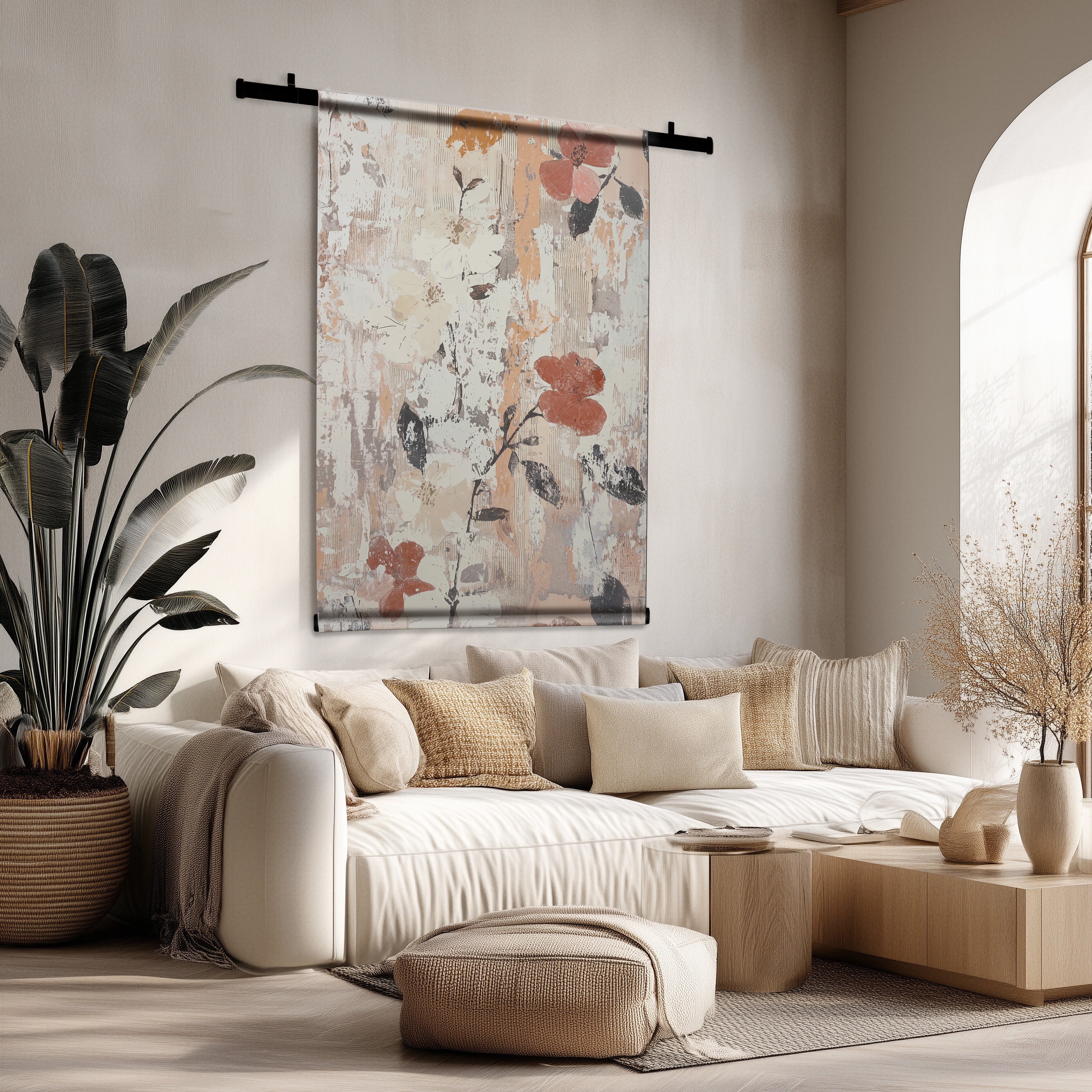 Dit wandkleed voegt direct sfeer toe aan je woonkamer, slaapkamer of werkplek met zachte aardetinten en een subtiel bloemmotief. Het kunstzinnige design creëert een sfeervol en geborgen gevoel, terwijl je kunt kiezen uit Mezo – een robuuste matte stof met een natuurlijke uitstraling – of Velours, een luxe stof met een subtiele zijdeglans. Dit stijlvolle muuraccent sluit perfect aan bij diverse woonstijlen zoals bohemian, Scandinavisch en minimalistisch, en zorgt voor een uniek en sfeervol kunstwerk aan je muur.