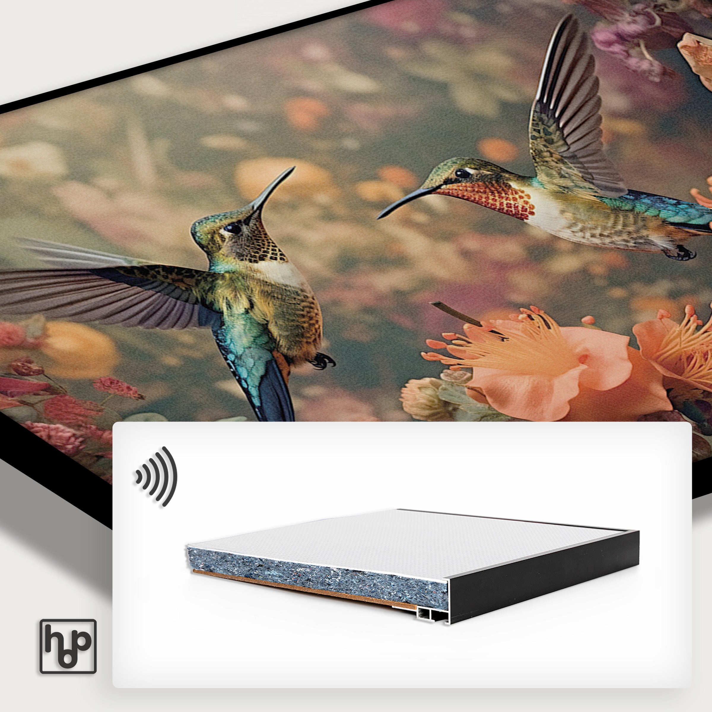 Het paneel bestaat uit hoogwaardig akoestisch materiaal met een print op zacht doek,