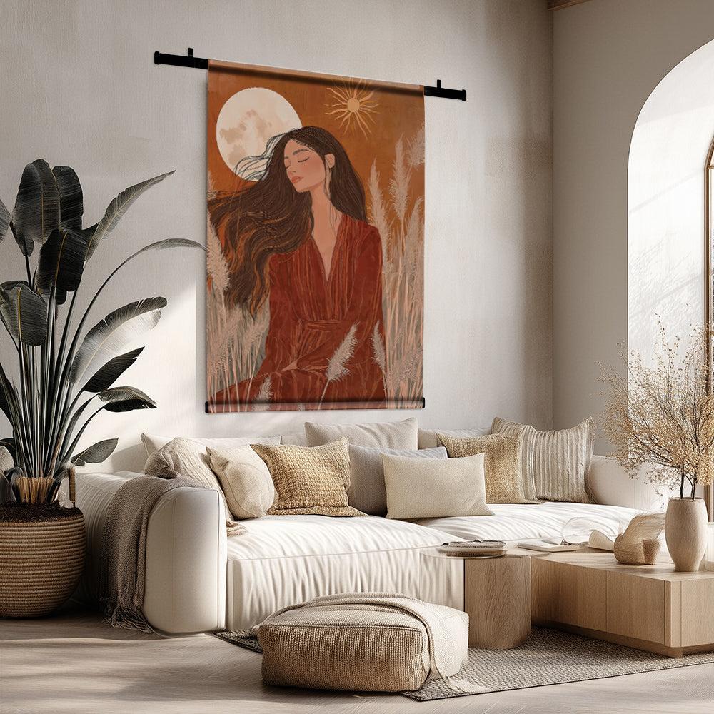 Met haar serene afbeelding van een vrouw omringd door maan, zon en siergrassen voegt dit wandkleed een sfeervol en warm element toe aan je woonkamer, slaapkamer of werkplek. Kies zelf voor Mezo, een robuuste matte stof met een natuurlijke uitstraling, of Velours, een luxe stof met subtiele zijdeglans. Dit stijlvolle muuraccent past perfect in woonstijlen zoals bohemian, zen/japandi/minimalistisch en industrieel. De rijke, warme kleuren en het unieke ontwerp zorgen voor een sfeervol kunstwerk dat karakter en diepte in je interieur brengt.