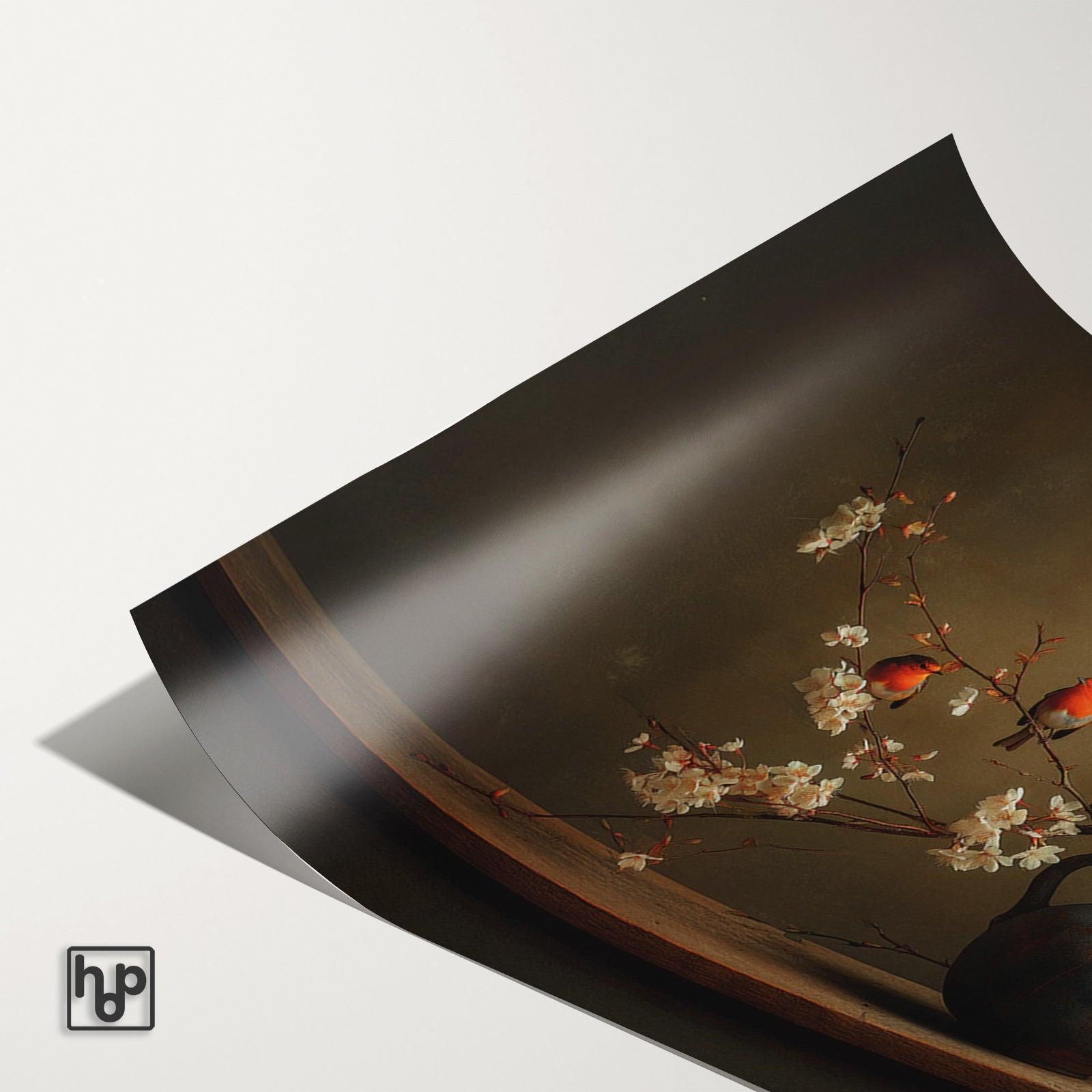 Deze liggende poster met roodborstjes geeft je woonkamer, slaapkamer of werkplek een sfeervol en stijlvol muuraccent. De zachte contrasten en natuurlijke kleuren zorgen voor een kalm maar levendig effect dat uitnodigt tot ontspanning. Dankzij het tijdloze ontwerp past deze wanddecoratie perfect binnen een breed scala aan woonstijlen, van landelijk en bohemian tot scandinavisch en minimalistisch. Deze unieke muurkunst functioneert zowel als designposter als elegant kunstwerk en maakt je interieur direct sfeervoller en persoonlijker.