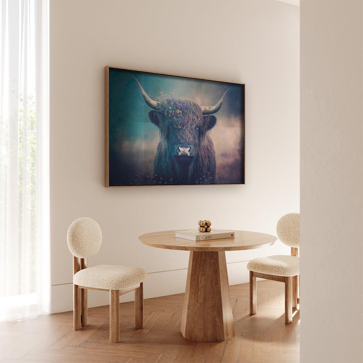 Deze zwart-witte designposter van de highland cow creëert met zijn sterke contrast en subtiele details een sfeervol muuraccent. Perfect om warmte en natuur in je woonkamer, slaapkamer of werkplek te brengen. Dankzij het rustige en krachtige beeld past dit kunstwerk uitstekend bij landelijke, Scandinavische en minimalistische interieurstijlen. Als veelzijdige muurkunst accentueert het jouw wanddecoratie met een stijlvol, botanisch thema.