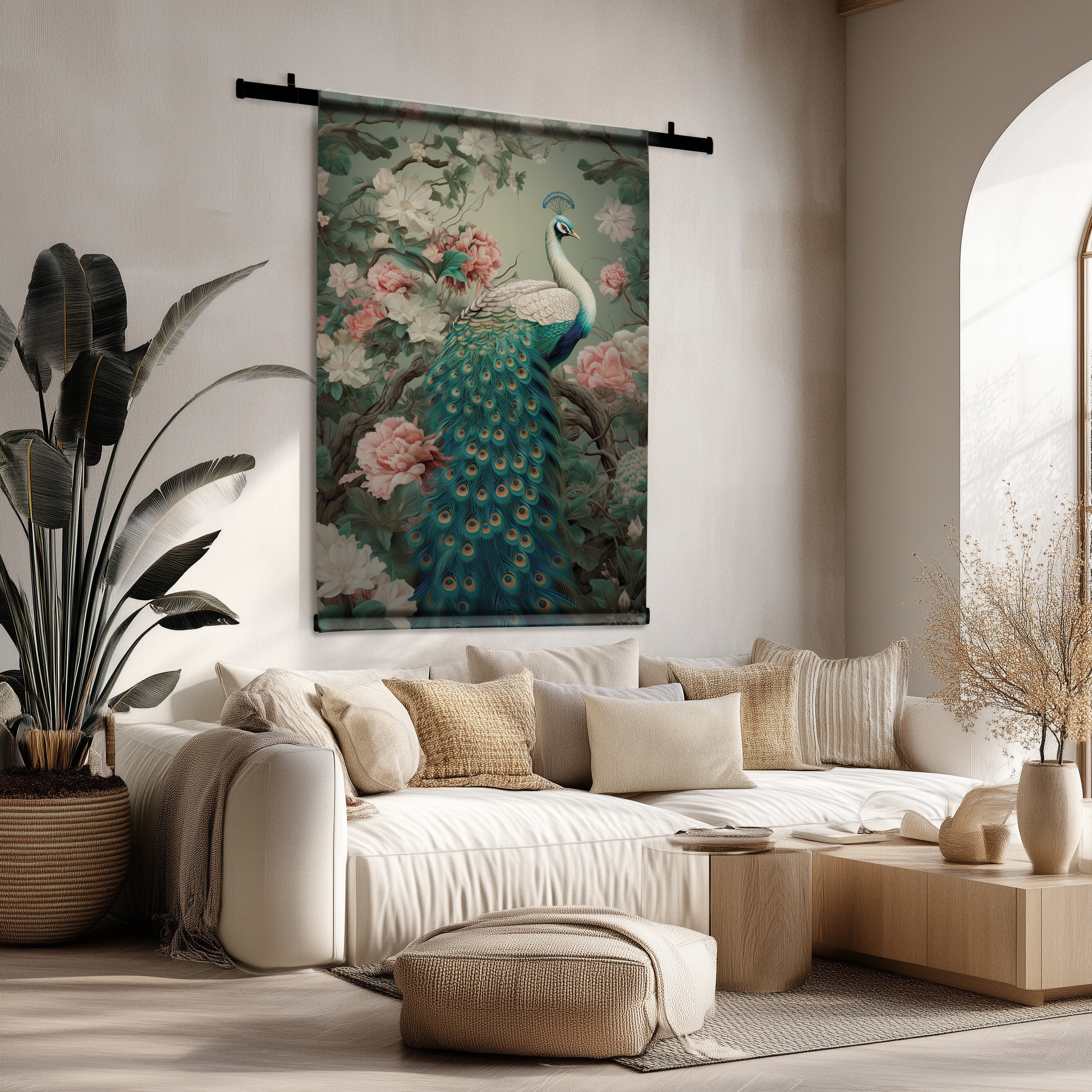 Breng een sfeer van rust en elegantie in je interieur met het Peacock 12 wandkleed. Dit verfijnde muuraccent vangt de schittering van pauwenveren en geeft elke ruimte een stijlvolle uitstraling.