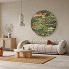 Deze muurcirkel van aluminium dibond met het ontwerp "Asian landscape" straalt rust en harmonie uit. De subtiele aardetinten en gedetailleerde contouren van een landschap vol zachte heuvels, bomen en traditionele architectuur brengen een kalmerende sfeer in elke ruimte. Dit kunstwerk is perfect om een stijlvolle en serene touch toe te voegen aan bijvoorbeeld jouw woonkamer, slaapkamer of kantoor. Door het ronde formaat en de natuurlijke kleuren vormt deze aluminium wanddecoratie een blikvanger die subtiel en elegant de ruimte verrijkt.