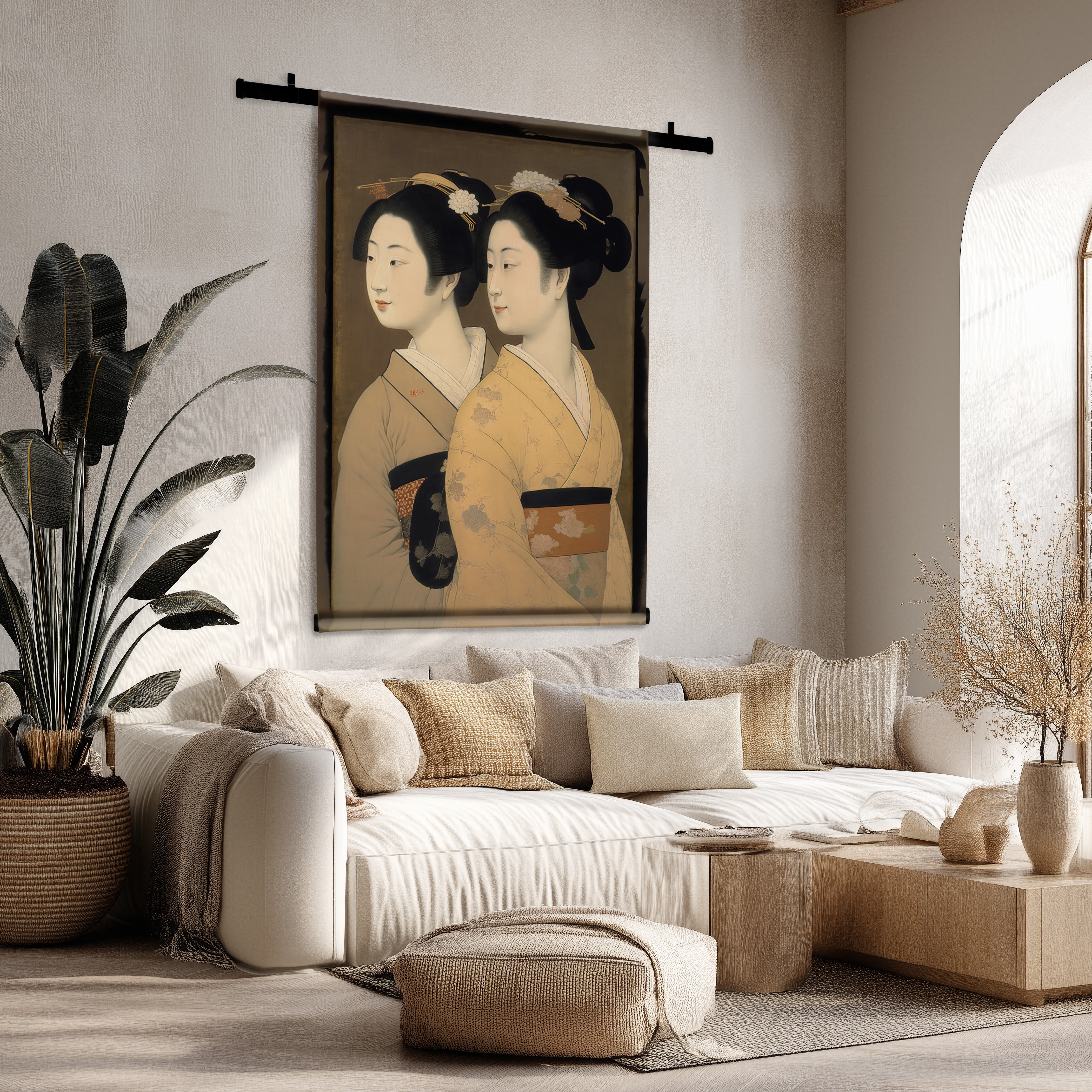 Dit wandkleed met Geisha’s straalt een serene en verfijnde sfeer uit die elke ruimte versterkt met een subtiele Aziatische elegantie. Het unieke ontwerp brengt rust en harmonie, perfect om jouw interieur te verrijken.