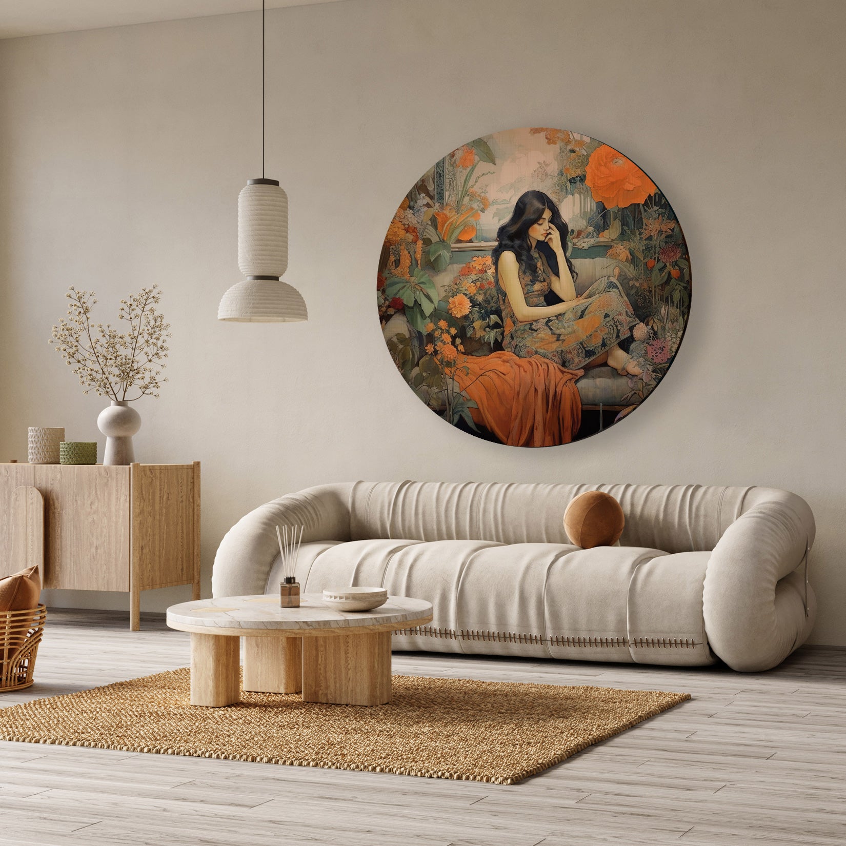Deze muurcirkel van aluminium dibond toont een stijlvol en ingetogen ontwerp met een vrouwelijk portret en zachte, natuurlijke kleuren. De warme oranje tinten gecombineerd met aardse groenen creëren een harmonieuze sfeer die perfect past in een modern interieur. Dit kunstwerk geeft jouw woonkamer, slaapkamer of kantoor een elegante en rustgevende uitstraling en fungeert als een subtiele blikvanger aan de wand.