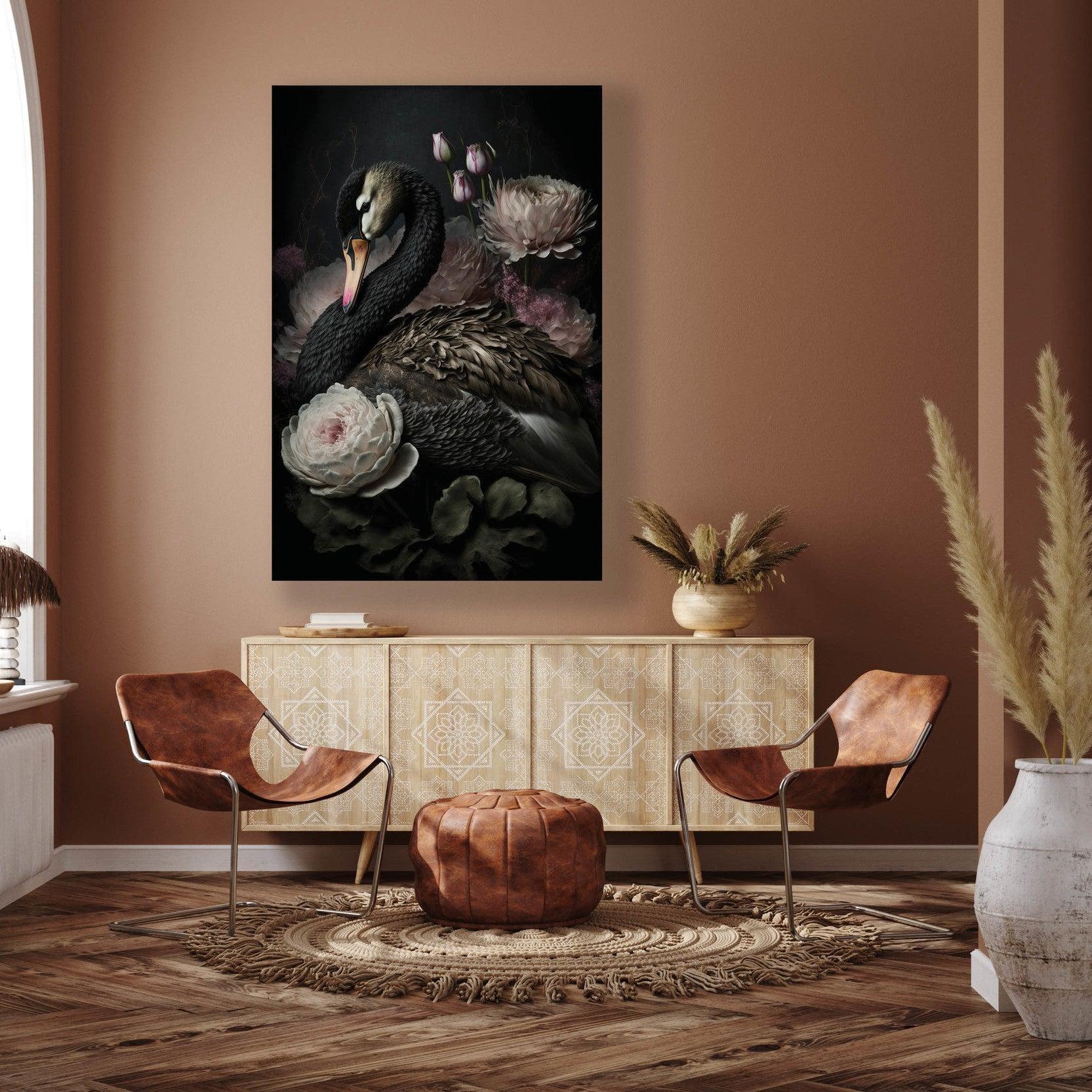 Breng een serene en verfijnde sfeer in je interieur met deze Black Swan poster. De elegante zwaan omringd door weelderige bloemen geeft jouw ruimte een kalme en stijlvolle uitstraling.