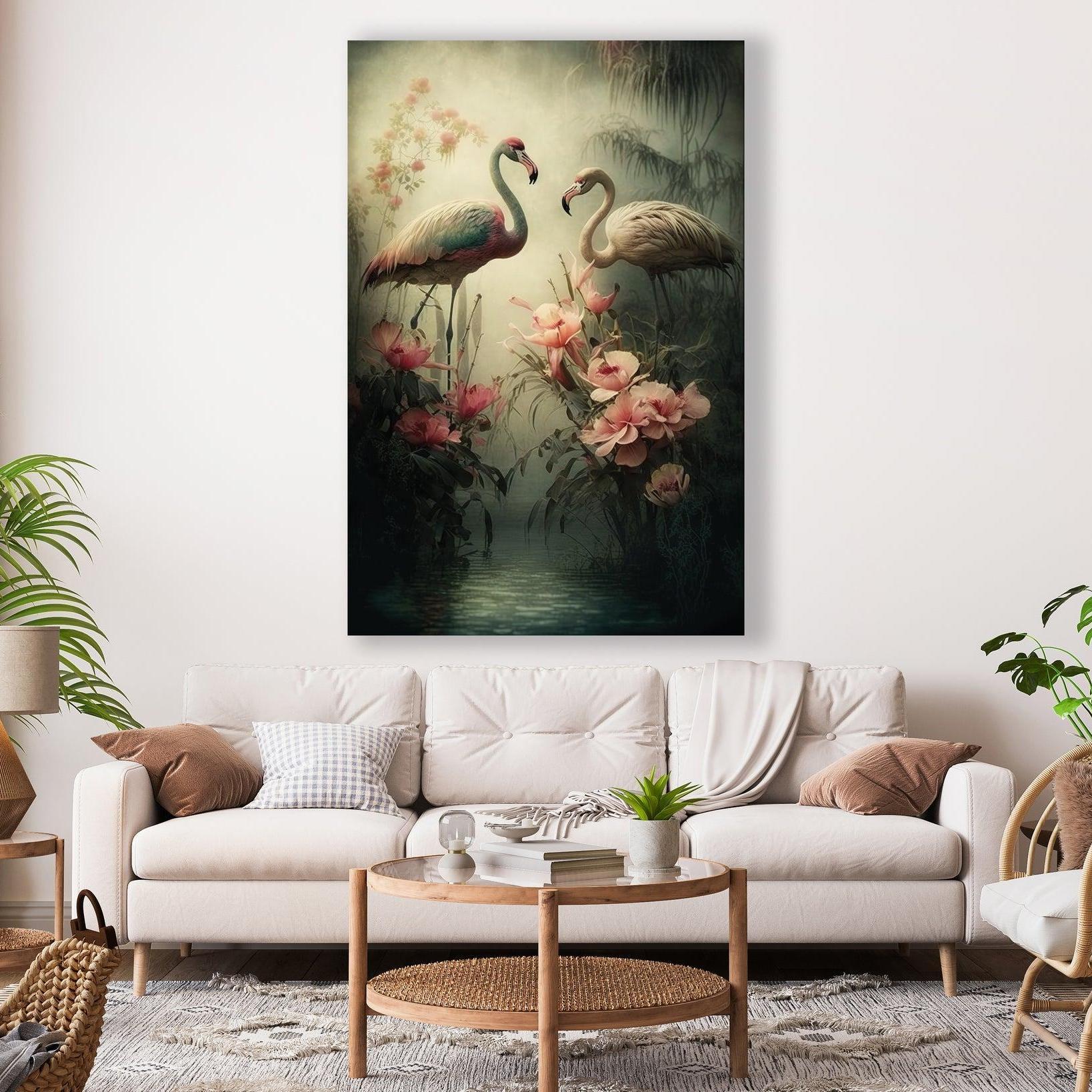 Deze botanische wanddecoratie toont twee sierlijke flamingo’s in zachte vintage kleuren, die een subtiele natuurlijke charme toevoegen aan je muurkunst. Het rustige kleurpalet en de florale accenten creëren een harmonieuze uitstraling die perfect past in een landelijk, scandinavisch of zen/japandi interieur. Deze designposter werkt sfeervol in de woonkamer, slaapkamer of werkplek en vormt een stijlvol muuraccent dat je interieur een uniek en sfeervol tintje geeft.