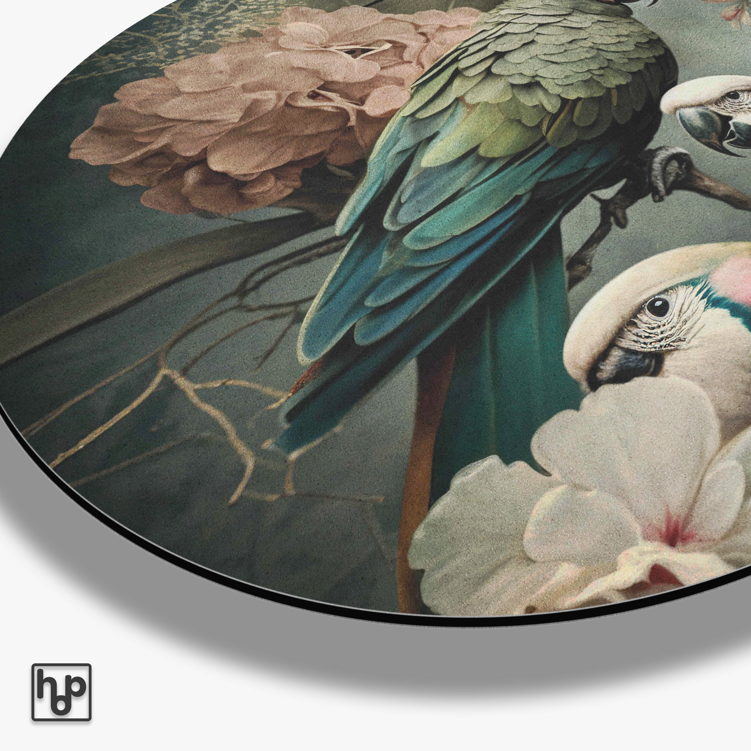 Deze muurcirkel van aluminium dibond, getiteld Floral Parrots 3 · Aluminium, straalt een rustige en natuurlijke sfeer uit. Het gedetailleerde ontwerp van tropische papegaaien omringd door zachte bloemen zorgt voor een verfijnde uitstraling die jouw interieur verrijkt. Dit aluminium wanddecoratie kunstwerk past perfect in een moderne woonkamer, een stijlvolle slaapkamer of een inspirerend kantoor. Door de matige kleurencombinatie en het realistische patroon geeft het jouw ruimte een warme, natuurlijke touch zonder te overheersen.