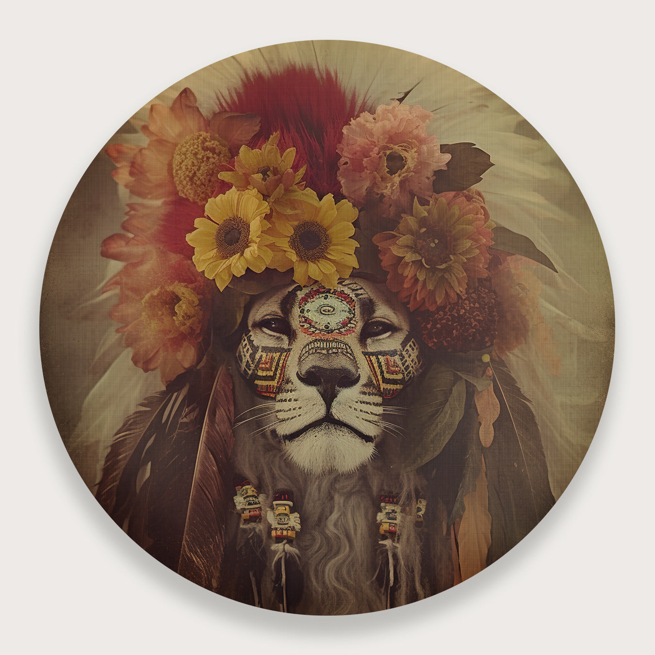 Deze muurcirkel van aluminium dibond met het ontwerp Lion 3 · Aluminium straalt kracht en mystiek uit. Het beeld van een leeuwenkop, versierd met kleurrijke bloemen en etnische details, geeft direct een verfijnde en artistieke sfeer aan je ruimte. Dit moderne kunstwerk voegt een stijlvolle en opvallende blikvanger toe aan bijvoorbeeld je woonkamer, slaapkamer, kantoor of hal. De combinatie van warme kleuren zoals rood, geel en aardetinten versterkt de levendigheid en zorgt voor een inspirerende uitstraling.