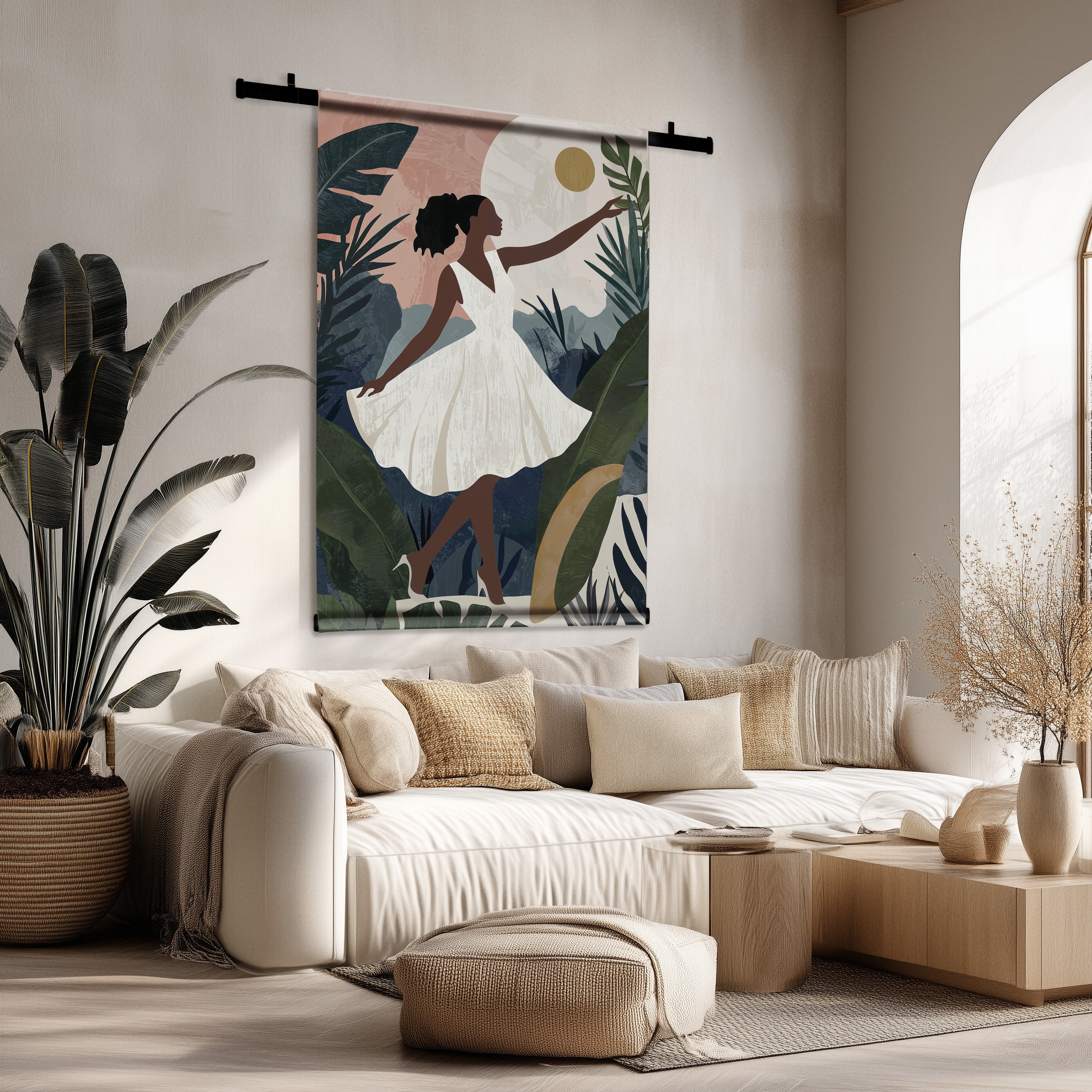Het Sophia wandkleed voegt eenvoudig sfeer toe aan je woonkamer, slaapkamer of werkplek. Dankzij het subtiele kleurgebruik en de zachte textuur ervaar je direct een warme, boho-energie die rust uitstraalt. Kies uit Mezo, een robuuste matte stof met een natuurlijke uitstraling, of Velours, een luxe stof met subtiele zijdeglans, en geef jouw wanddecoratie een persoonlijke touch. Dit kunstwerk past perfect in een bohemian, landelijk of minimalistisch interieur en is daarmee een stijlvol muuraccent dat nooit verveelt.