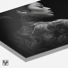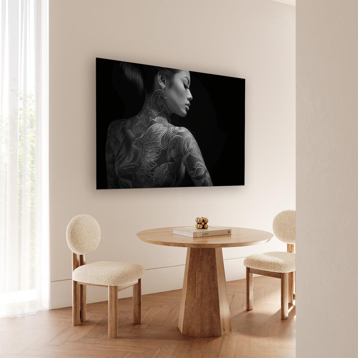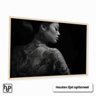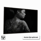 Breng een krachtige en rustige sfeer in je interieur met deze elegante zwart-wit poster. Dit liggende portret van een vrouw met tatoeages geeft je muur een expressief en stijlvol accent dat direct opvalt.