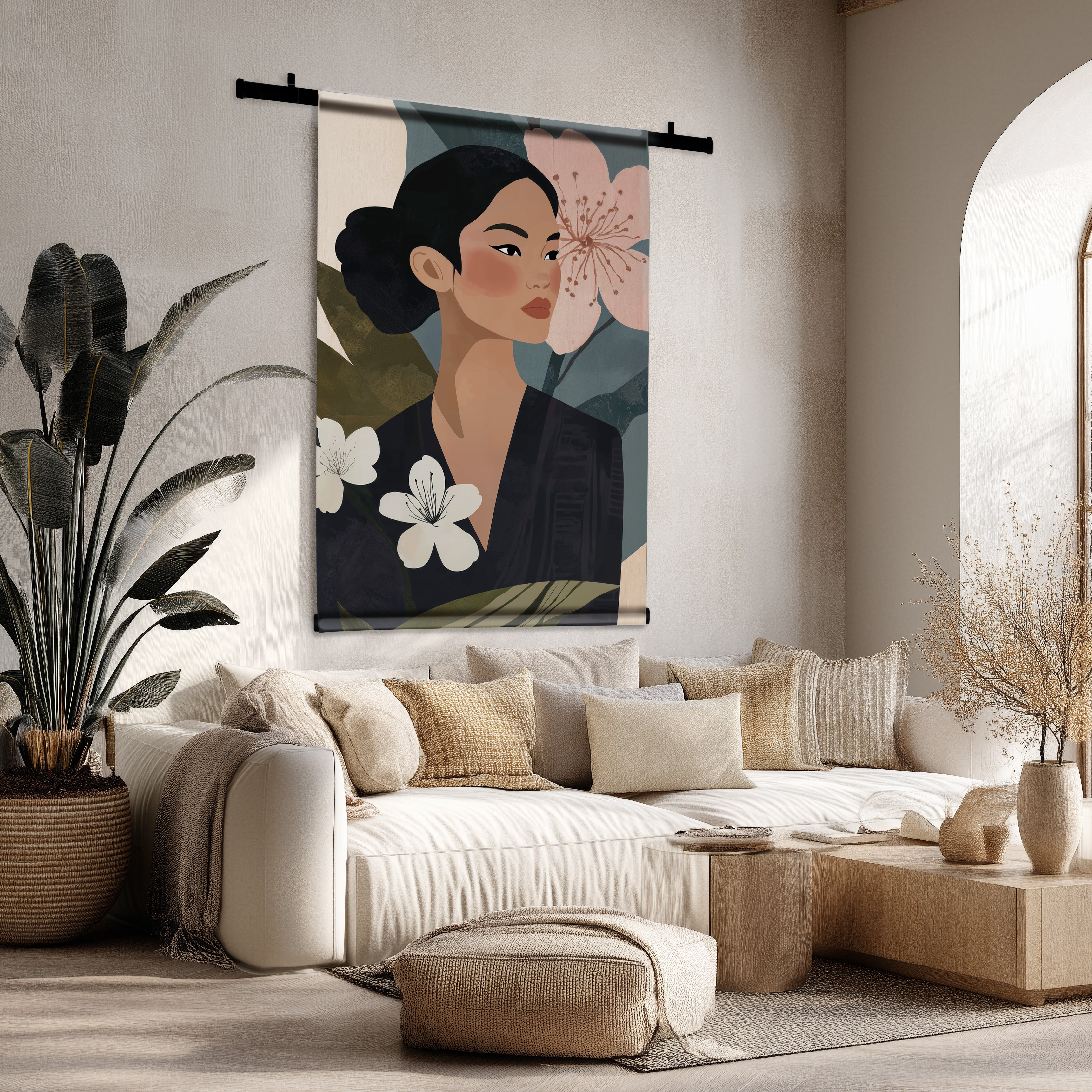 Dit wandkleed voegt karakter toe aan je woonkamer, slaapkamer of werkplek met zijn subtiele kleuren en verfijnde details van mensen en Aziatische elementen. Je kiest zelf voor Mezo – een robuuste matte stof met een natuurlijke uitstraling – of luxe velours met een zachte zijdeglans. Door de rijke textuur en het unieke ontwerp past dit stijlvolle muurkunstwerk perfect binnen bohemian, zen/japandi en moderne interieurstijlen. Het resultaat? Een kalme, sfeervolle ruimte die uitnodigt tot ontspanning.