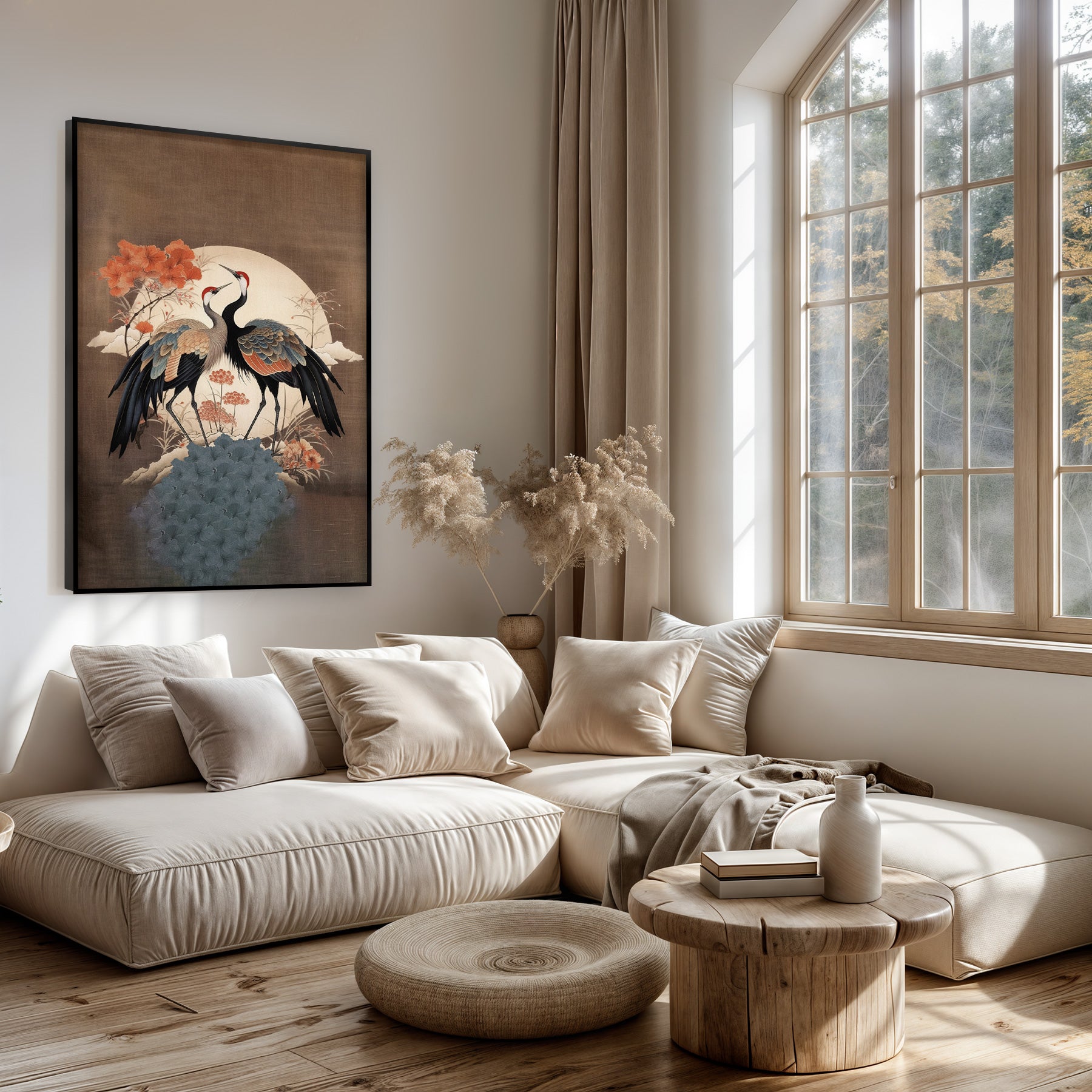 Het artframe Japanese Cranes 2 komt het beste tot zijn recht in ruimtes waar sfeer en flexibiliteit belangrijk zijn. In de woonkamer voegt het een verfijnde touch toe zonder dominant te zijn, terwijl het in de slaapkamer zorgt voor een kalme, uitnodigende ambiance. Ook op kantoor of in de hal geeft dit wisselbaar kunstframe een professionele en persoonlijke uitstraling. De mogelijkheid om het doek te verwisselen maakt het een perfecte keuze voor wie regelmatig van stijl of stemming wil wisselen.