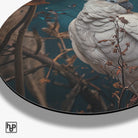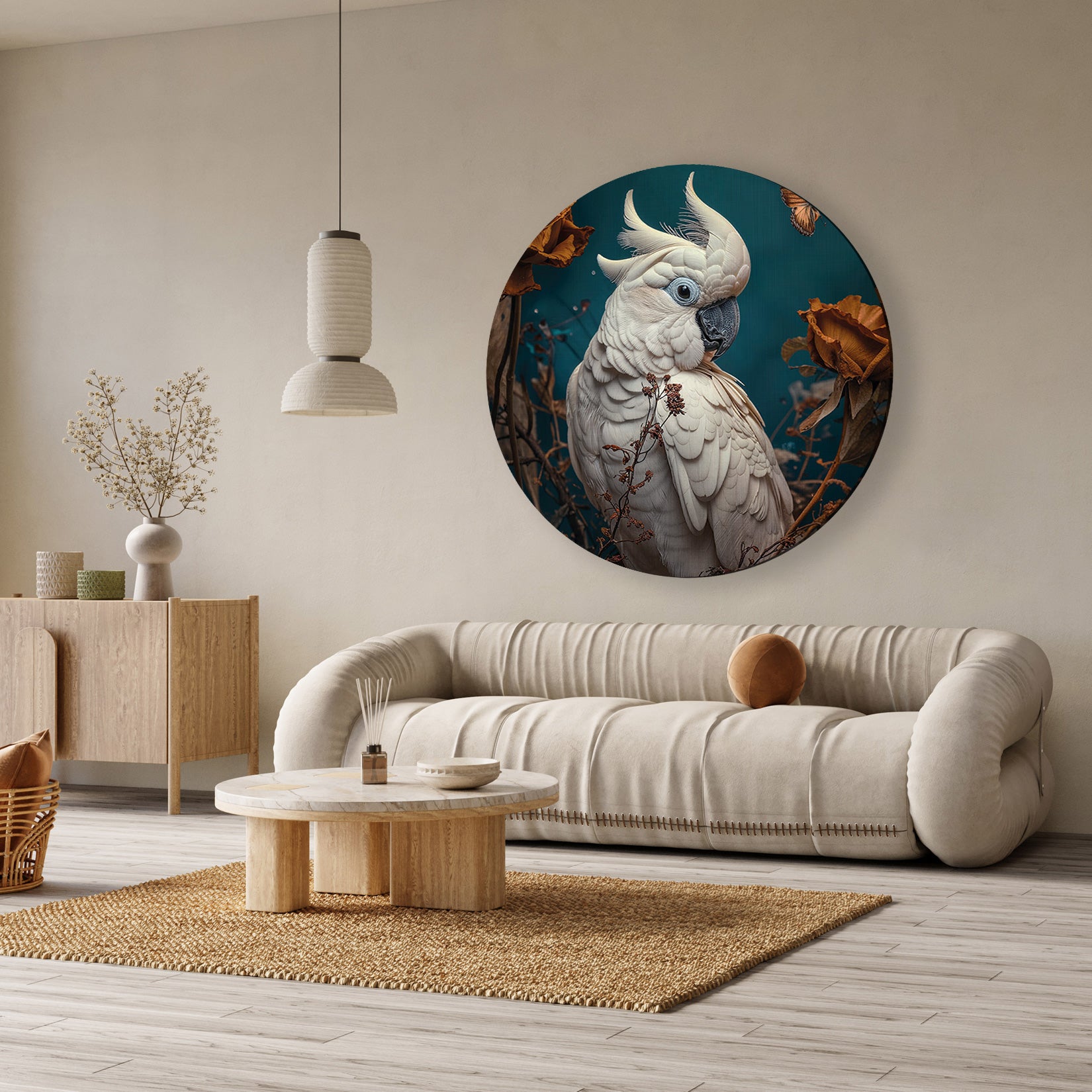 Deze muurcirkel van aluminium dibond met de afbeelding van een cockatoo brengt een stijlvolle en natuurlijke sfeer in jouw interieur. Het gedetailleerde ontwerp van deze prachtige witte papegaai, omringd door warme, gedroogde bloemen, creëert een rustige en elegante uitstraling. Dit kunstwerk is ideaal voor aan de muur in een woonkamer, slaapkamer, kantoor of hal en geeft elke ruimte een uniek en rustgevend accent.