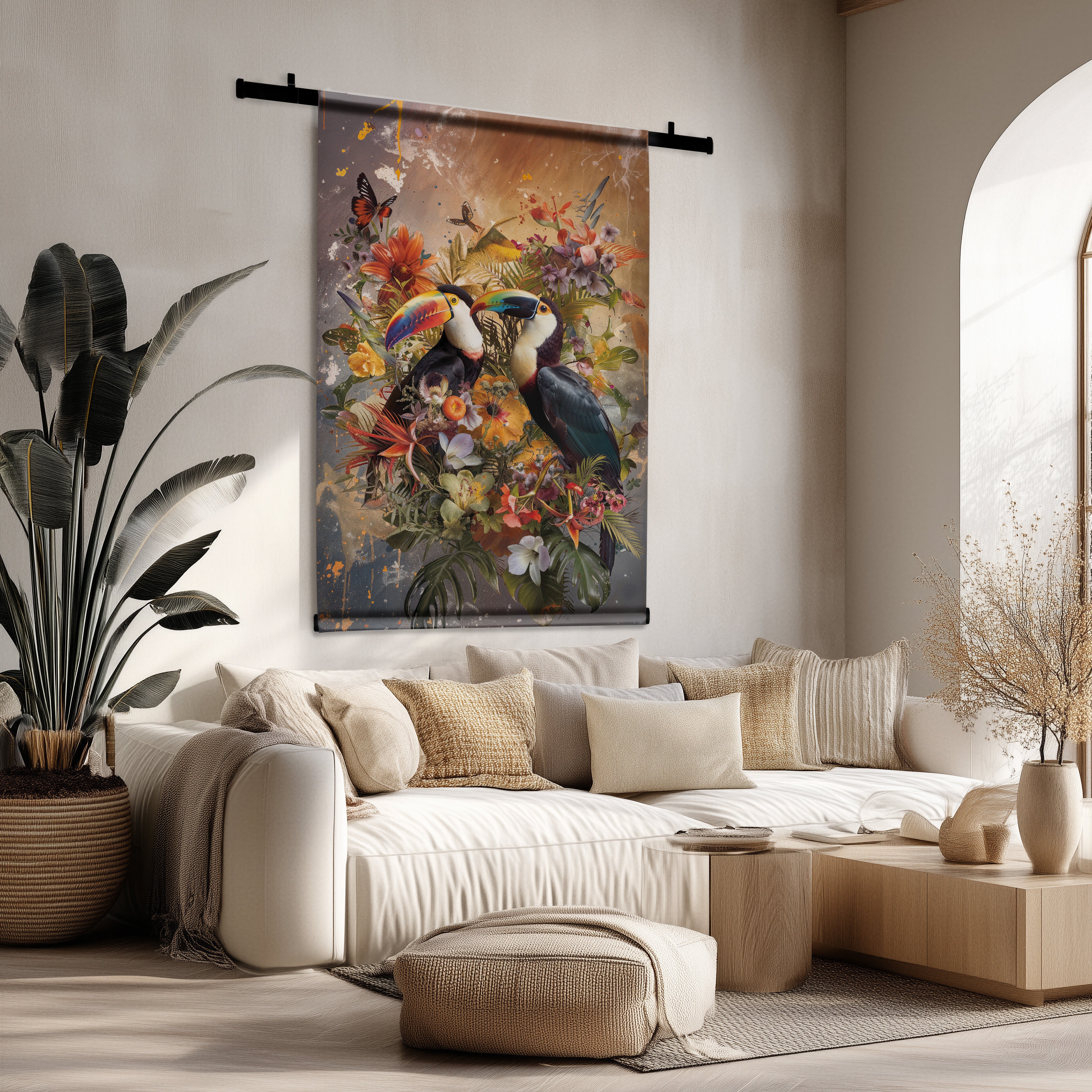 Breng een speelse en kleurrijke sfeer in huis met het Floral Toucans wandkleed, dat elke ruimte onmiddellijk verlevendigt en karakter geeft. Dit stijlvolle muuraccent combineert exotische toekans met levendige bloemen voor een unieke blikvanger die frisheid en energie toevoegt aan je interieur.