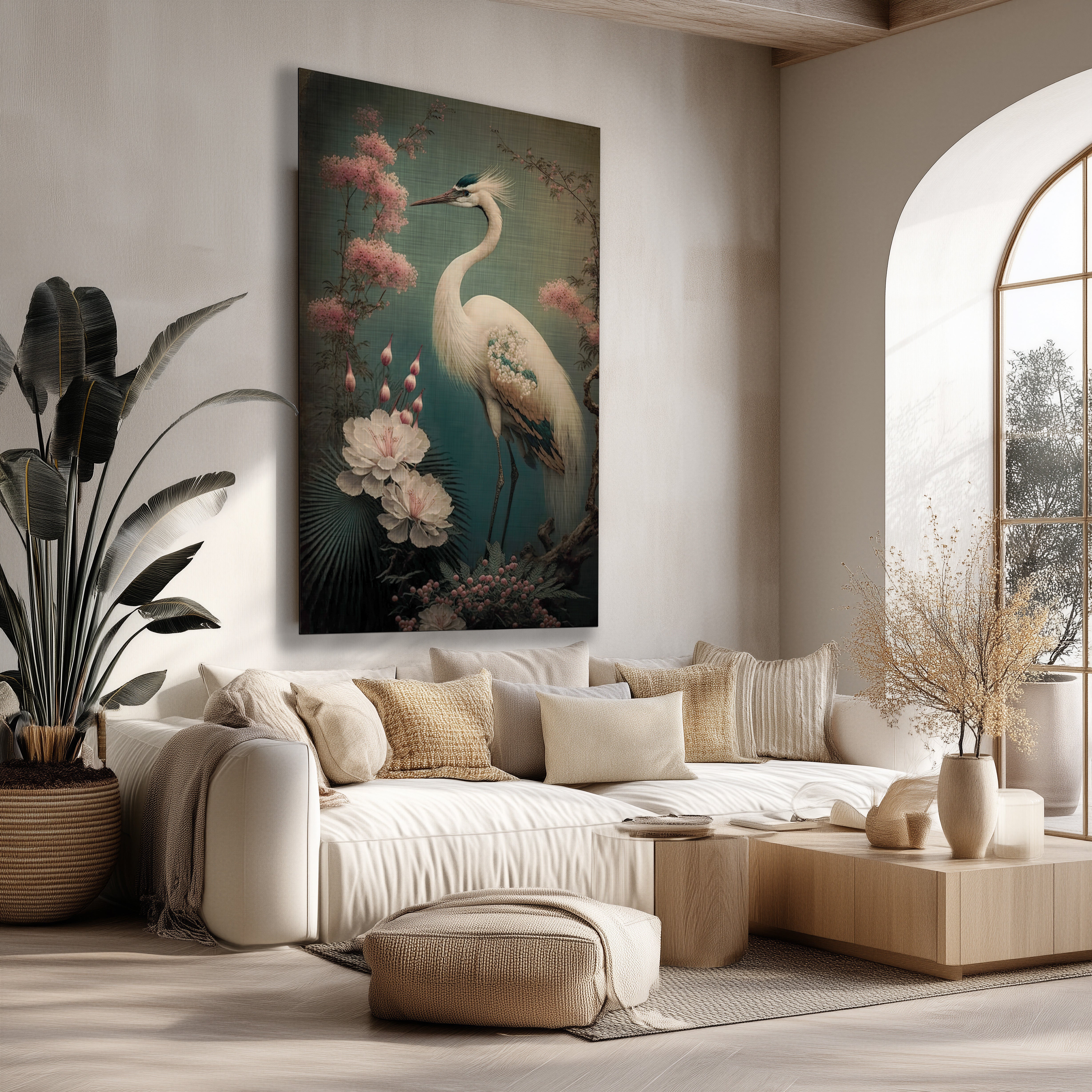 Breng een kalme en stijlvolle sfeer in je interieur met deze Japanse kraanvogel in vintage stijl. Dit design versterkt elke ruimte met een tijdloze elegantie en subtiele Aziatische charme.