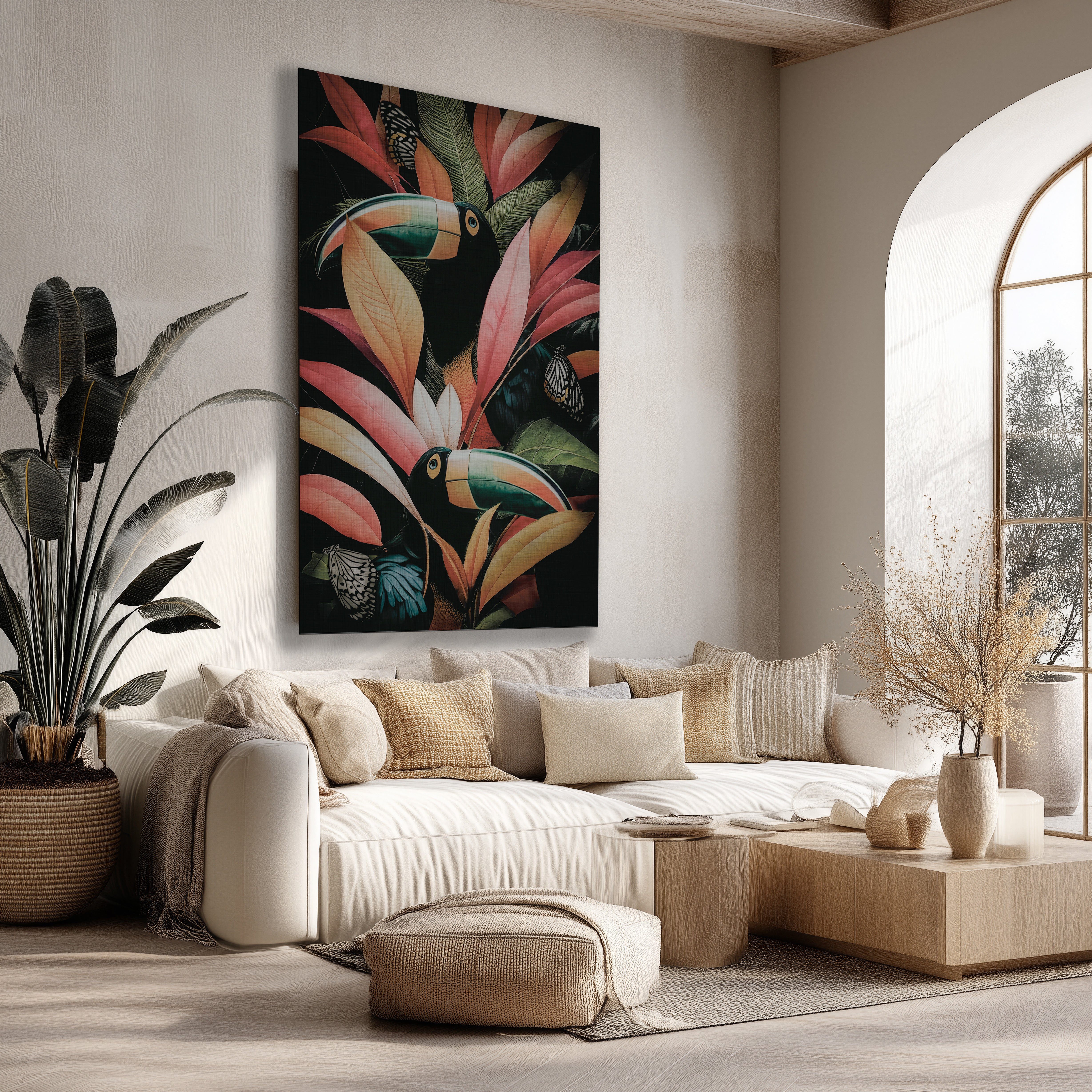 Deze staande poster voegt een opvallend stijlvol muuraccent toe dat de natuur letterlijk naar binnen haalt. De expressieve toucans en rijke groene bladeren zorgen voor een harmonieus contrast en brengen energie in je leefruimte. Door het natuurlijke thema past deze wanddecoratie perfect bij scandinavische, bohemian en landelijke interieurs. Als uniek ontwerp is het kunstwerk ideaal voor in de woonkamer, slaapkamer of werkplek en zorgt het voor een sfeervolle en inspirerende uitstraling.