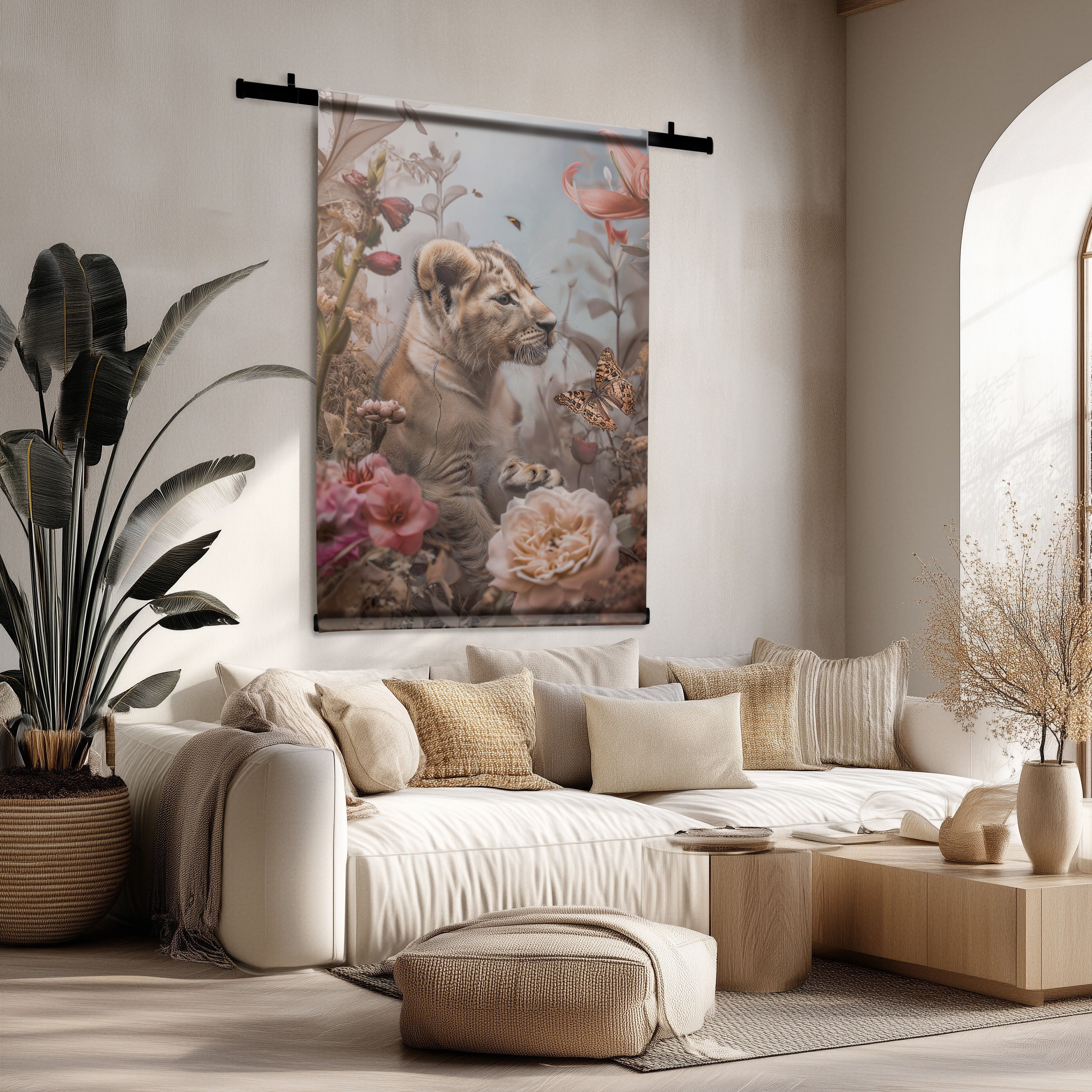 Dit stijlvolle muuraccent toont een charmante art print van een leeuwenwelpje, die met zachte, natuurlijke kleuren en een tedere uitstraling direct opvalt. Kies voor Mezo, een robuuste matte stof met een natuurlijke textuur, of ga voor het luxe velours met een subtiele zijdeglans die extra elegantie toevoegt. Deze unieke muurkunst past perfect binnen woonstijlen zoals landelijk, bohemian en scandinavisch, en geeft elke kamer een speels en sfeervol karakter. Dankzij het geluiddempende effect draagt het wandkleed bij aan een kalme en comfortabele sfeer, waar je graag tijd doorbrengt.