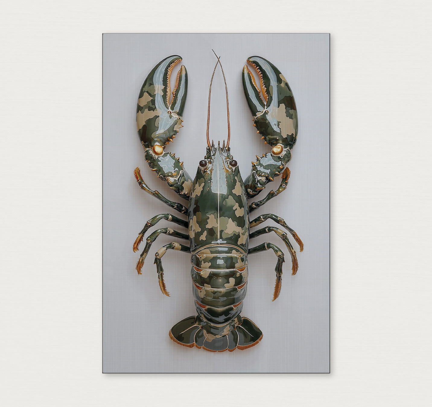Deze stoere poster brengt een krachtige en sfeervolle maritieme uitstraling in je interieur. Het unieke ontwerp met een kreeft in een camouflagepatroon en stijlvolle gouden accenten geeft direct karakter aan je muur.