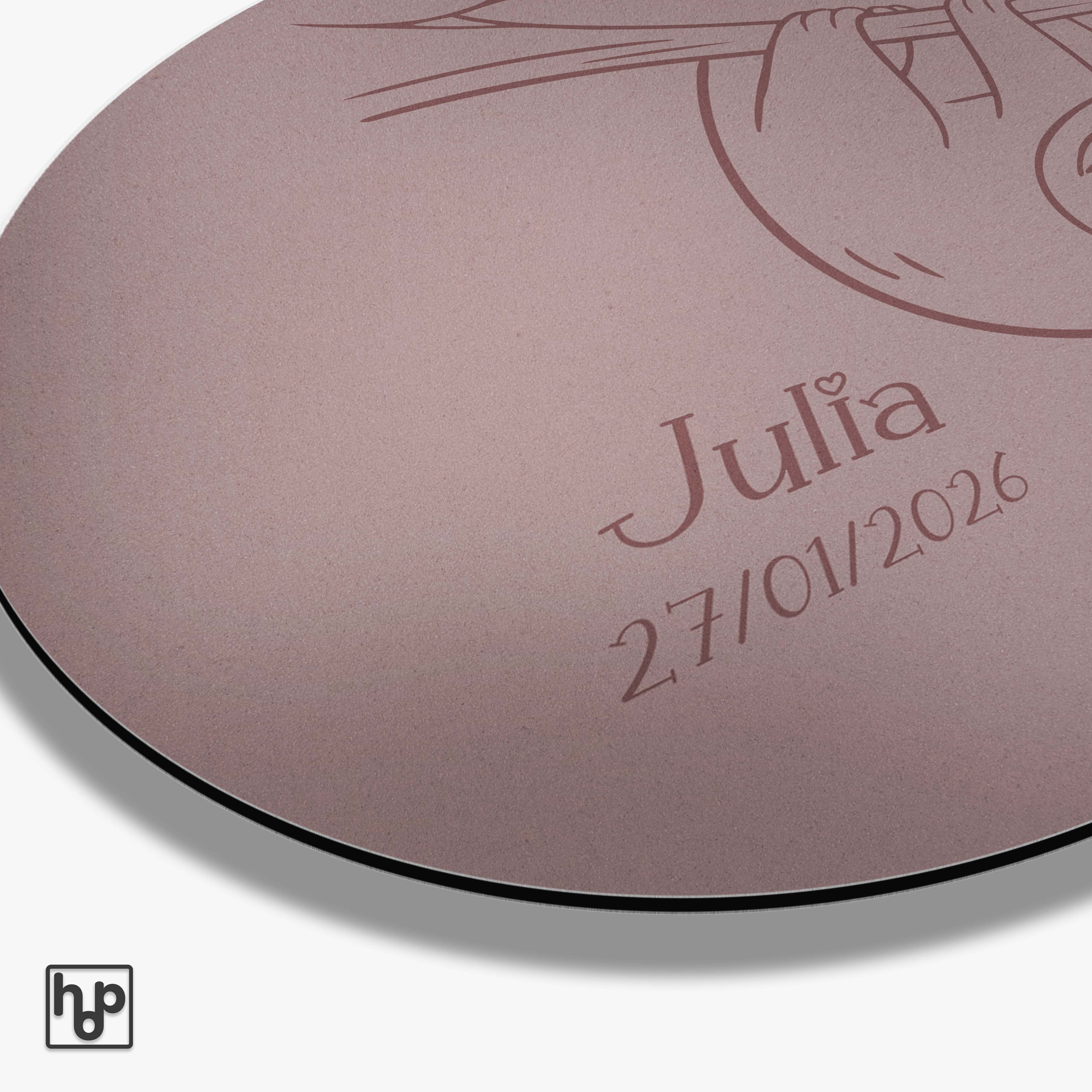 Deze muurcirkel met een schattige luiaard straalt een rustige en vriendelijke sfeer uit, perfect voor een baby- of kinderkamer. Het minimalistische en speelse ontwerp met zachte, natuurlijke tinten zorgt voor een warme, liefdevolle uitstraling. Door de naam en geboortedatum toe te voegen, krijgt de ruimte een persoonlijke en betekenisvolle touch die het bijzondere karakter van jouw kindje benadrukt.