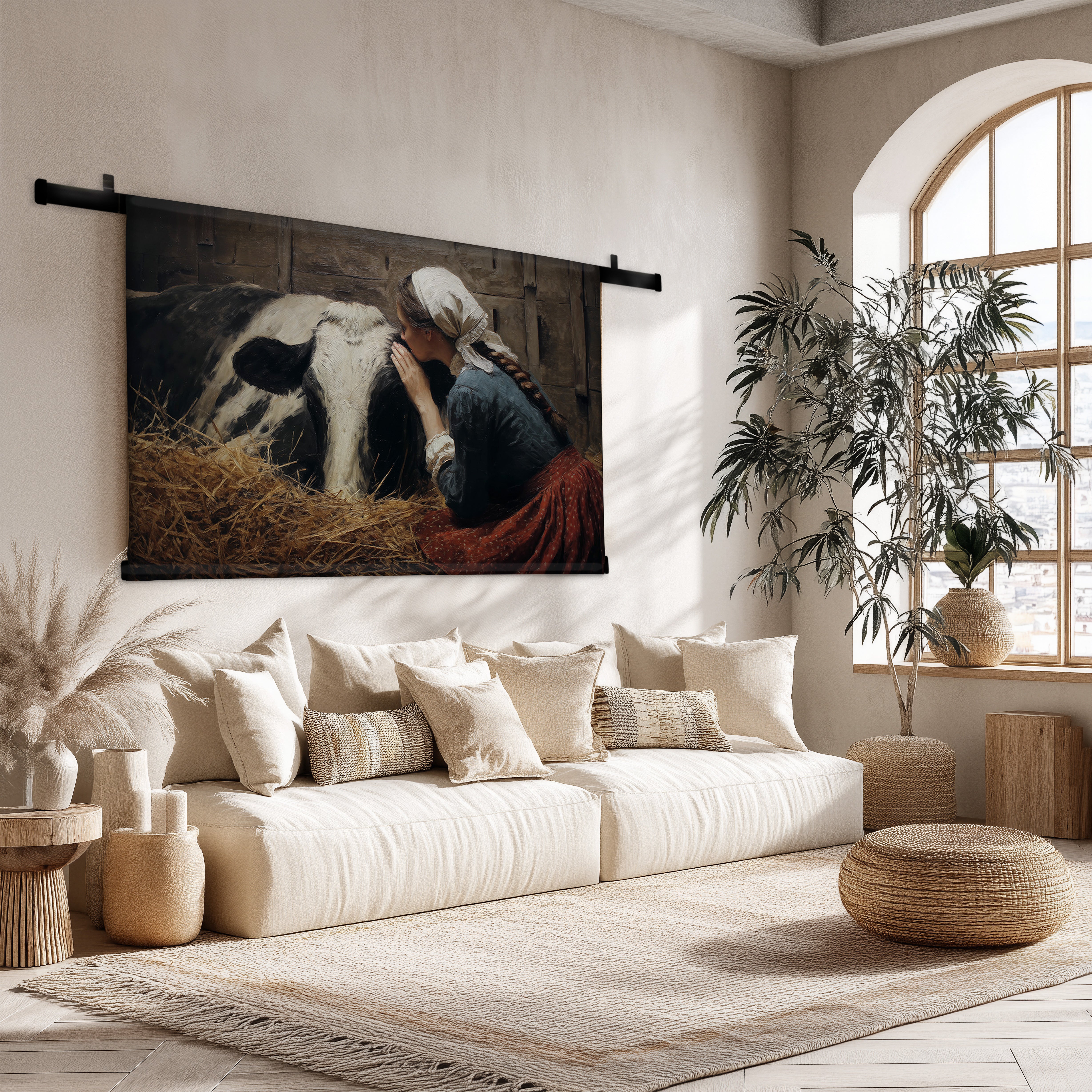 Breng een warme en rustgevende sfeer in huis met het wandkleed ‘Meisje en de koe’, dat een poëtische verbinding legt tussen mens en natuur. Dit kunstwerk versterkt je interieur met een uitnodigende landelijke uitstraling, vol mystiek en serene energie.