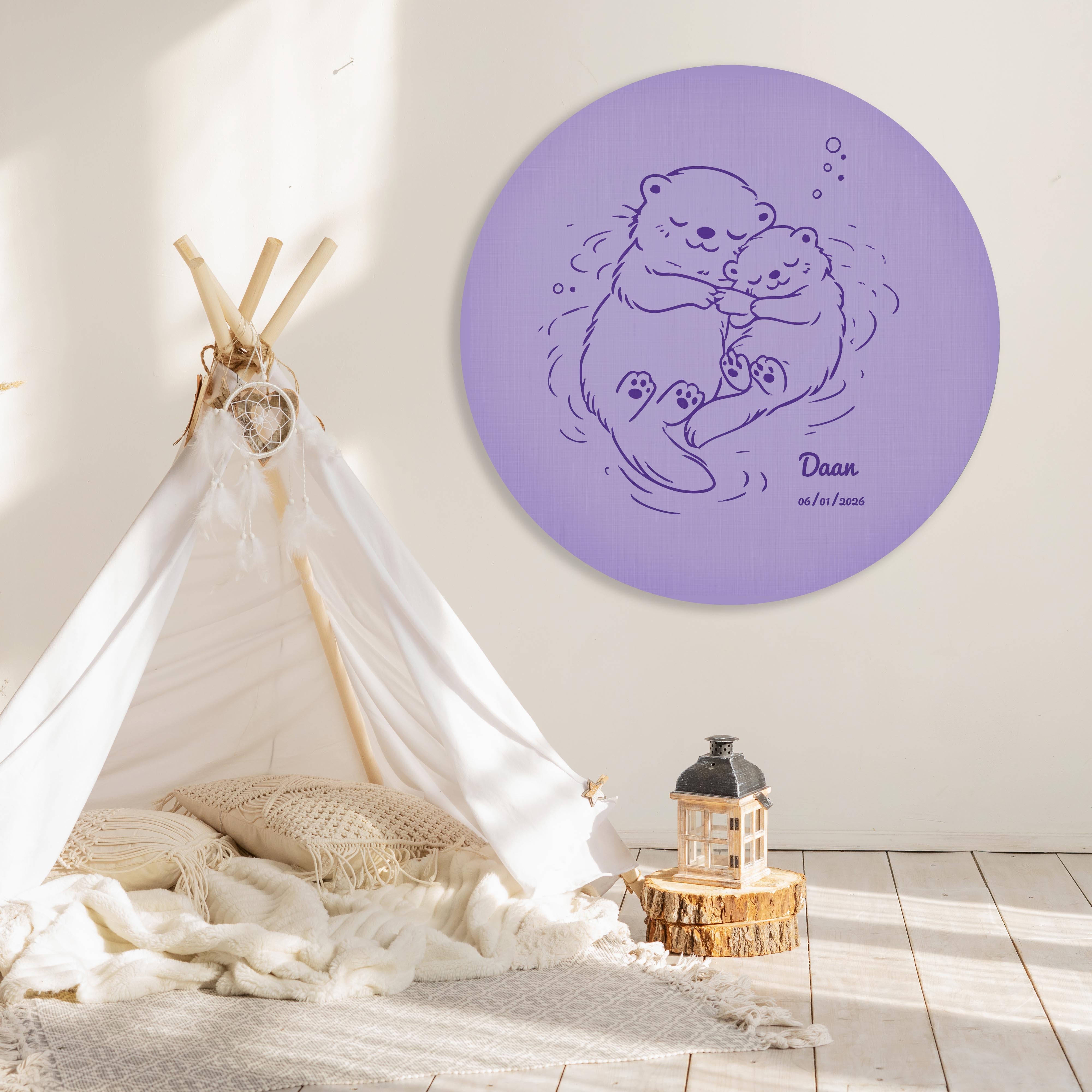 Deze personaliseerbare kunst voor de kinderkamer met het ontwerp Otters · Muurcirkel straalt een warme en liefdevolle sfeer uit. De twee knusse otters die elkaar in de armen sluiten zorgen voor een gevoel van rust en verbondenheid in de baby- of kinderkamer. Door de naam en geboortedatum toe te voegen, krijgt het kunstwerk een persoonlijke en liefdevolle uitstraling die het emotionele karakter van de ruimte versterkt.