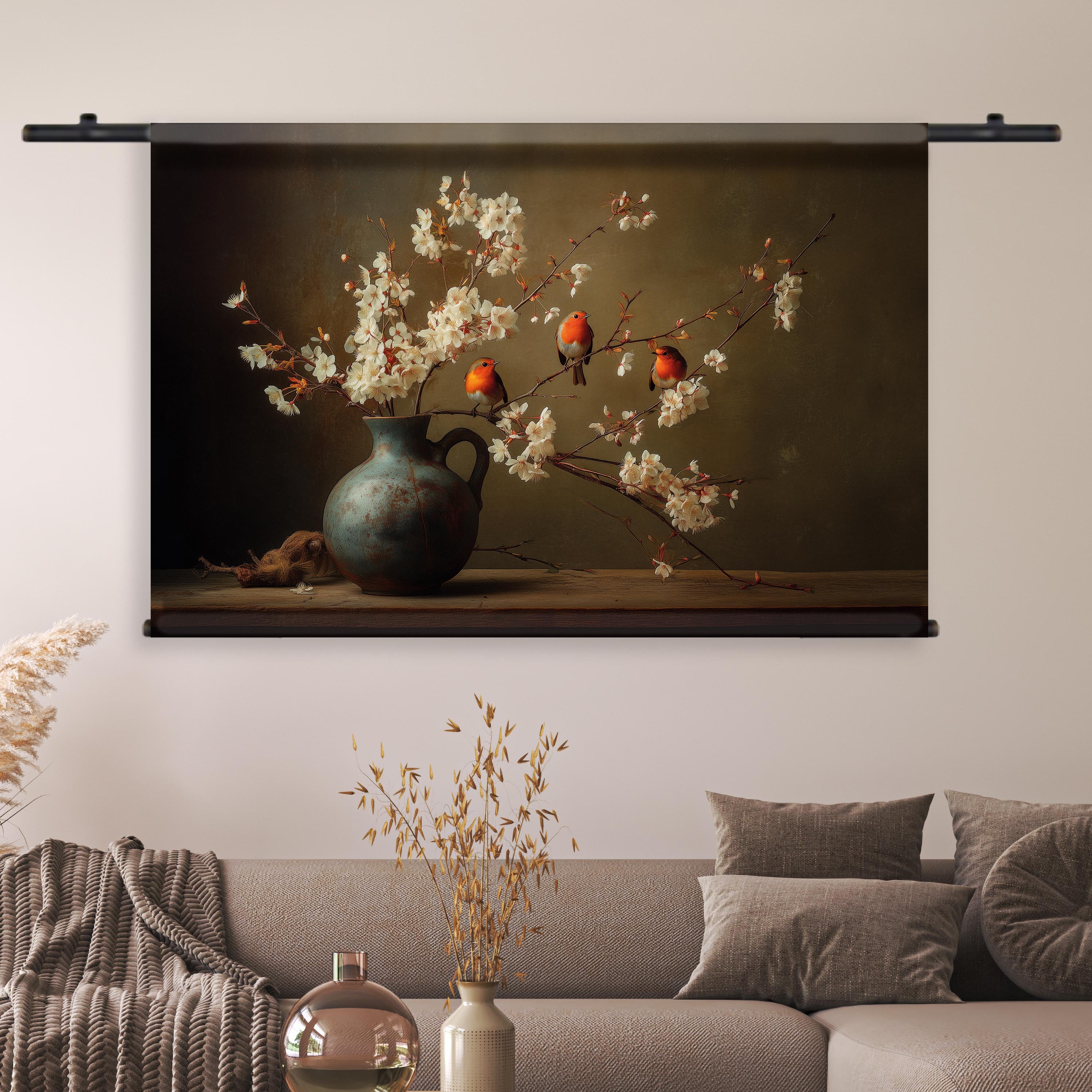 Dit wandkleed met roodborstjes brengt een warme, natuurlijke rust in je interieur en versterkt elke ruimte met een subtiele, sfeervolle uitstraling.