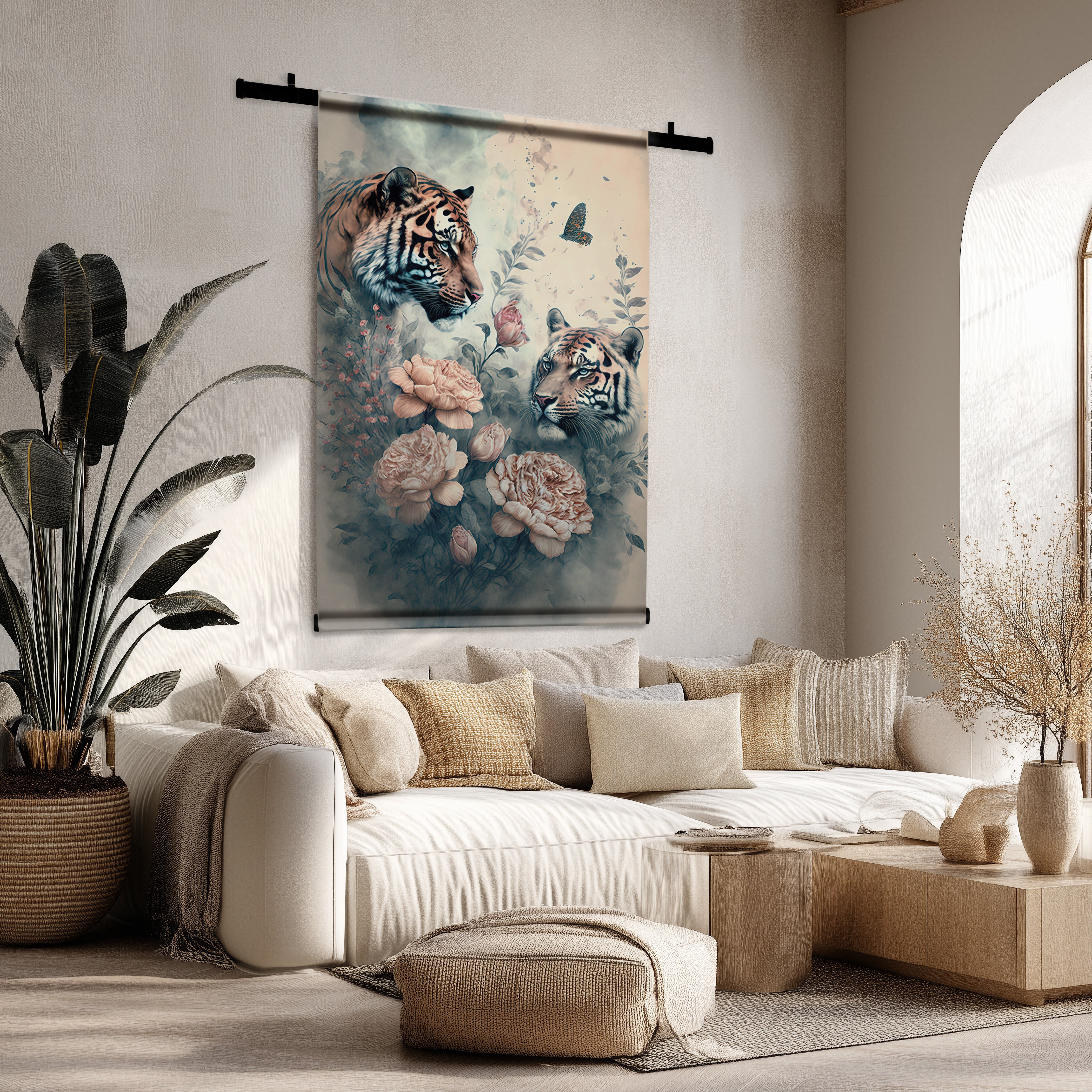 Ervaar de kracht en mystiek van de natuur met dit adembenemende Tigers wandkleed. Het stralende kunstwerk brengt een gevoel van rust en kracht in je interieur en nodigt uit tot bewondering elke keer dat je thuiskomt.