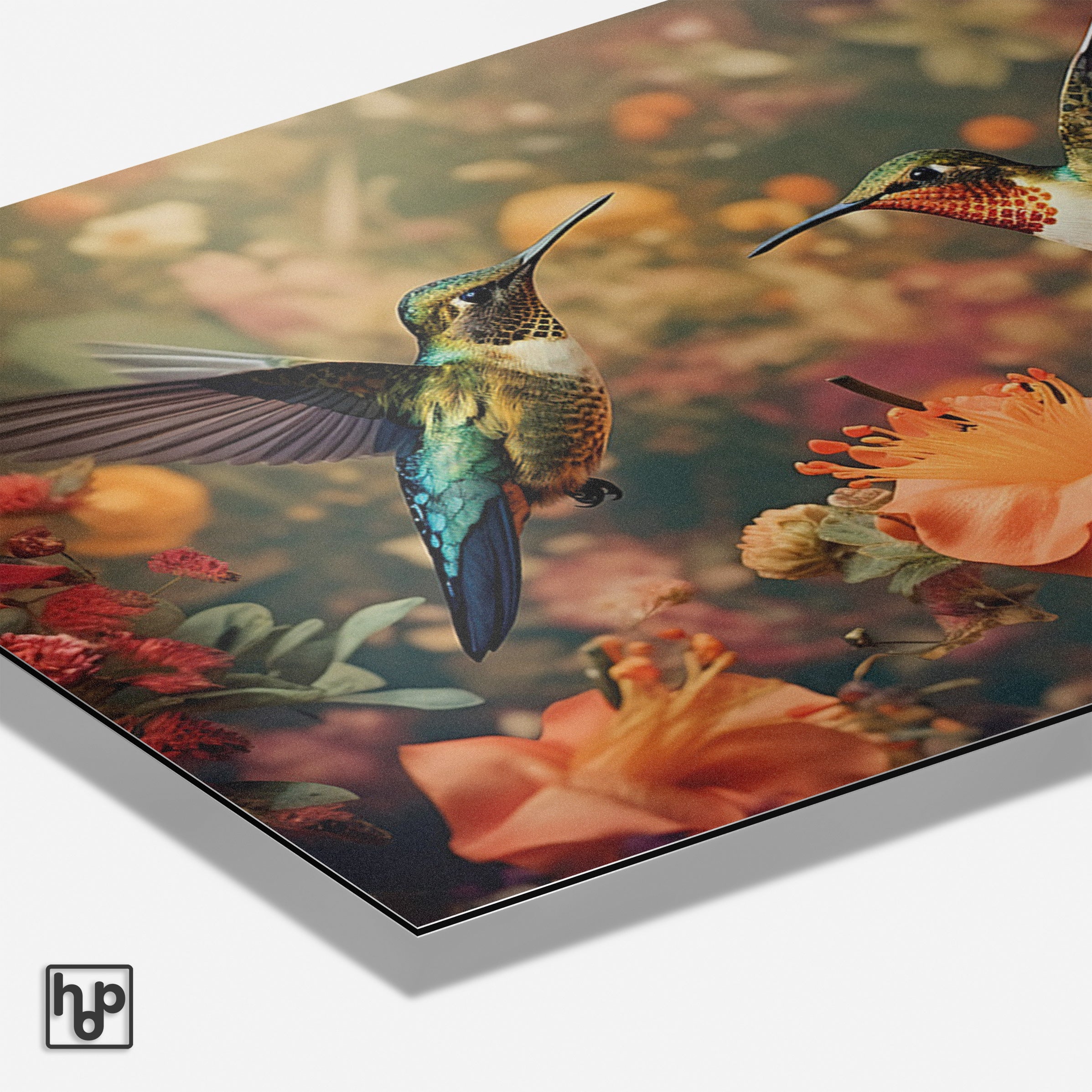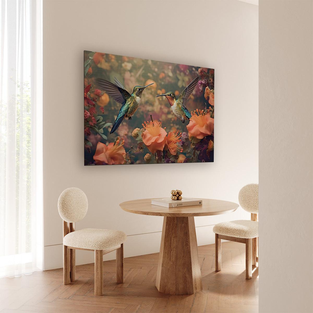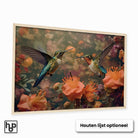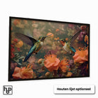 Zacht en levendig, deze botanische wanddecoratie met sierlijke kolibries versterkt jouw interieur met natuurlijke elegantie en rust. Het liggende formaat zorgt voor een harmonieus en stijlvol muuraccent dat uitnodigt tot ontspannen en genieten.