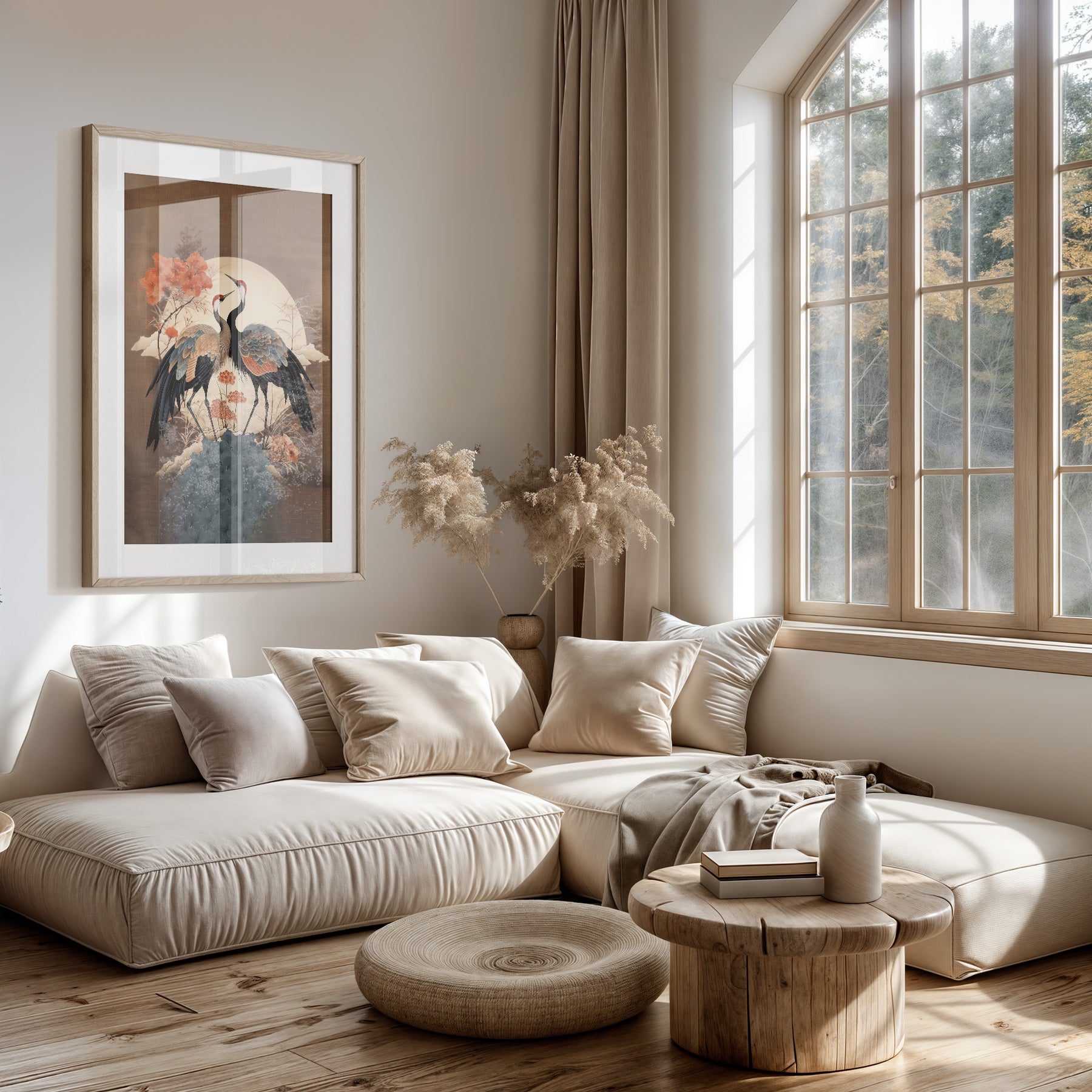 Met haar zachte kleuren en ingetogen contrast is dit kunstwerk ideaal om een kalme sfeer te creëren in de woonkamer, slaapkamer of werkplek. De combinatie van botanische elementen met vintage Japanse esthetiek maakt deze designposter uitermate geschikt voor interieurs in zen/japandi, minimalistisch, maar ook hotel chique en Scandinavisch. Als stijlvol muuraccent brengt het een verfijnde energie die uitnodigt tot ontspanning en inspiratie.