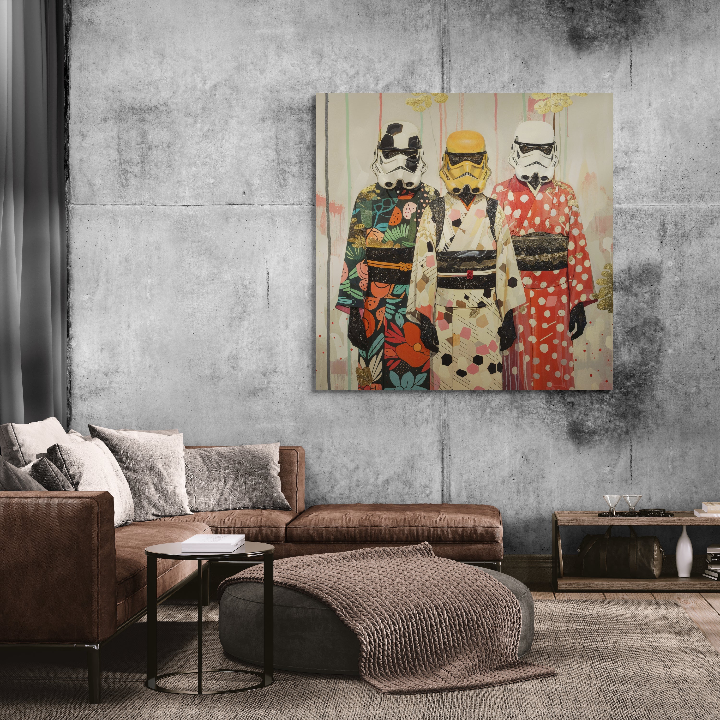 Wanddecoratie met stoere materialen zoals aluminium, canvas of textiel. Denk aan donkere kleuren, ruwe texturen en abstracte prints.