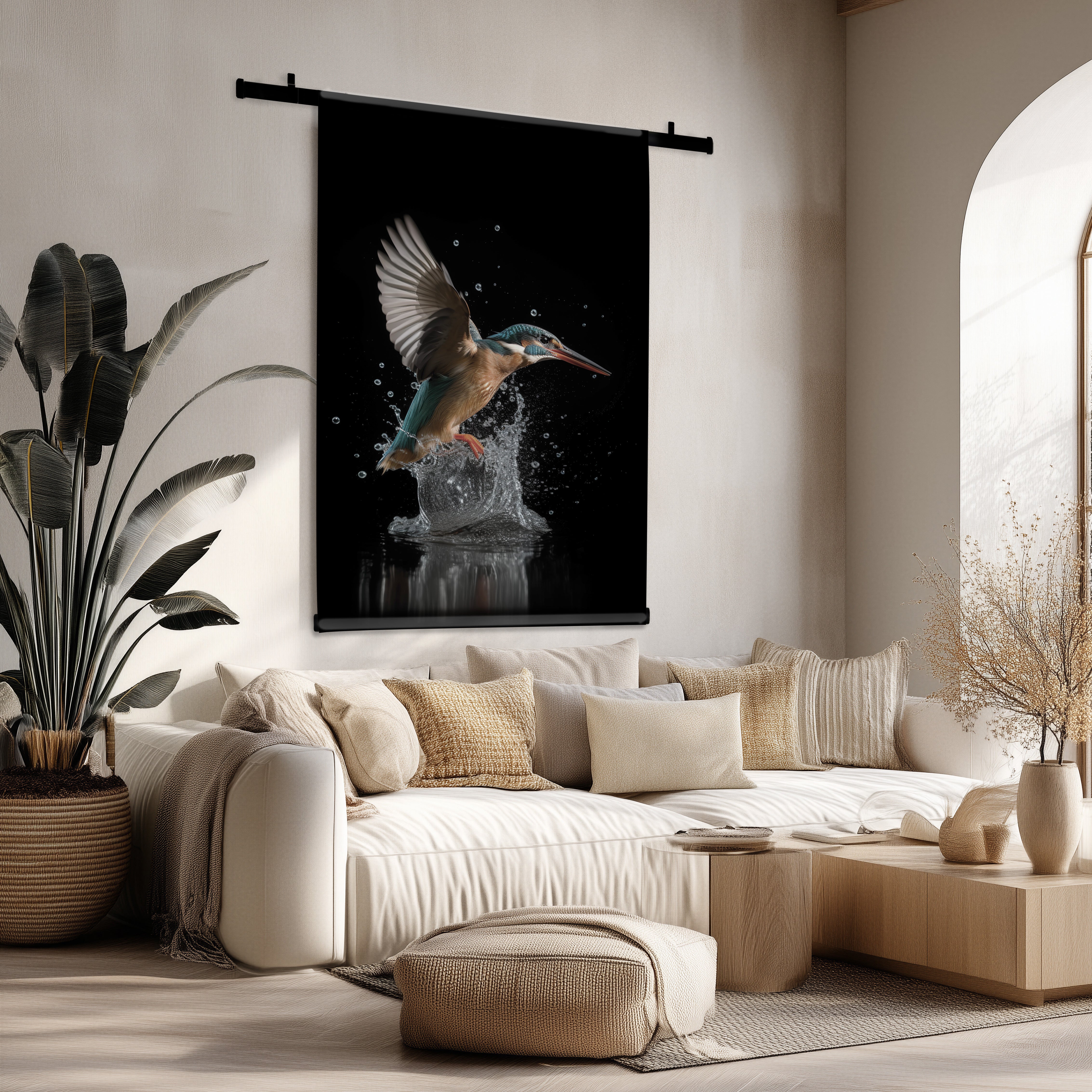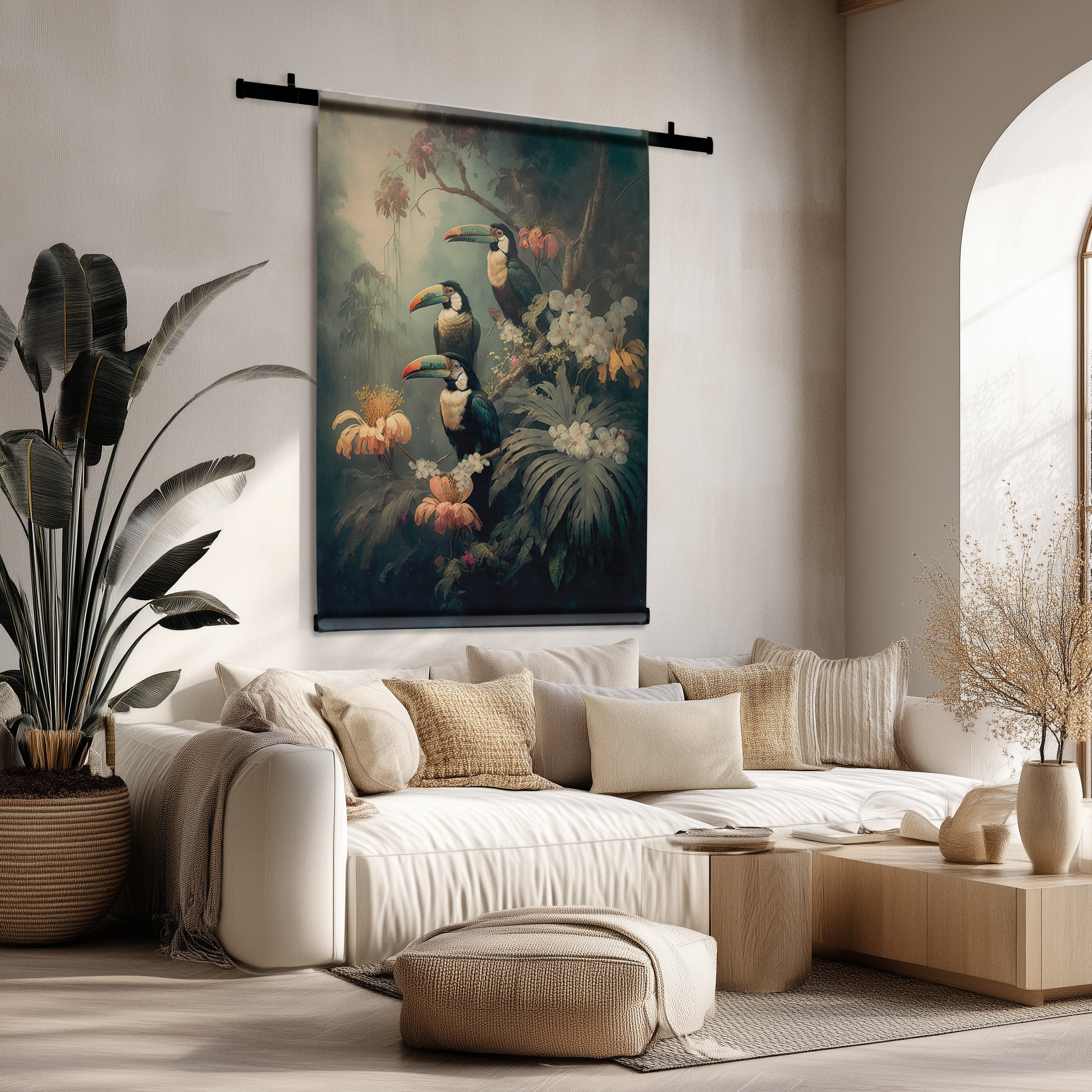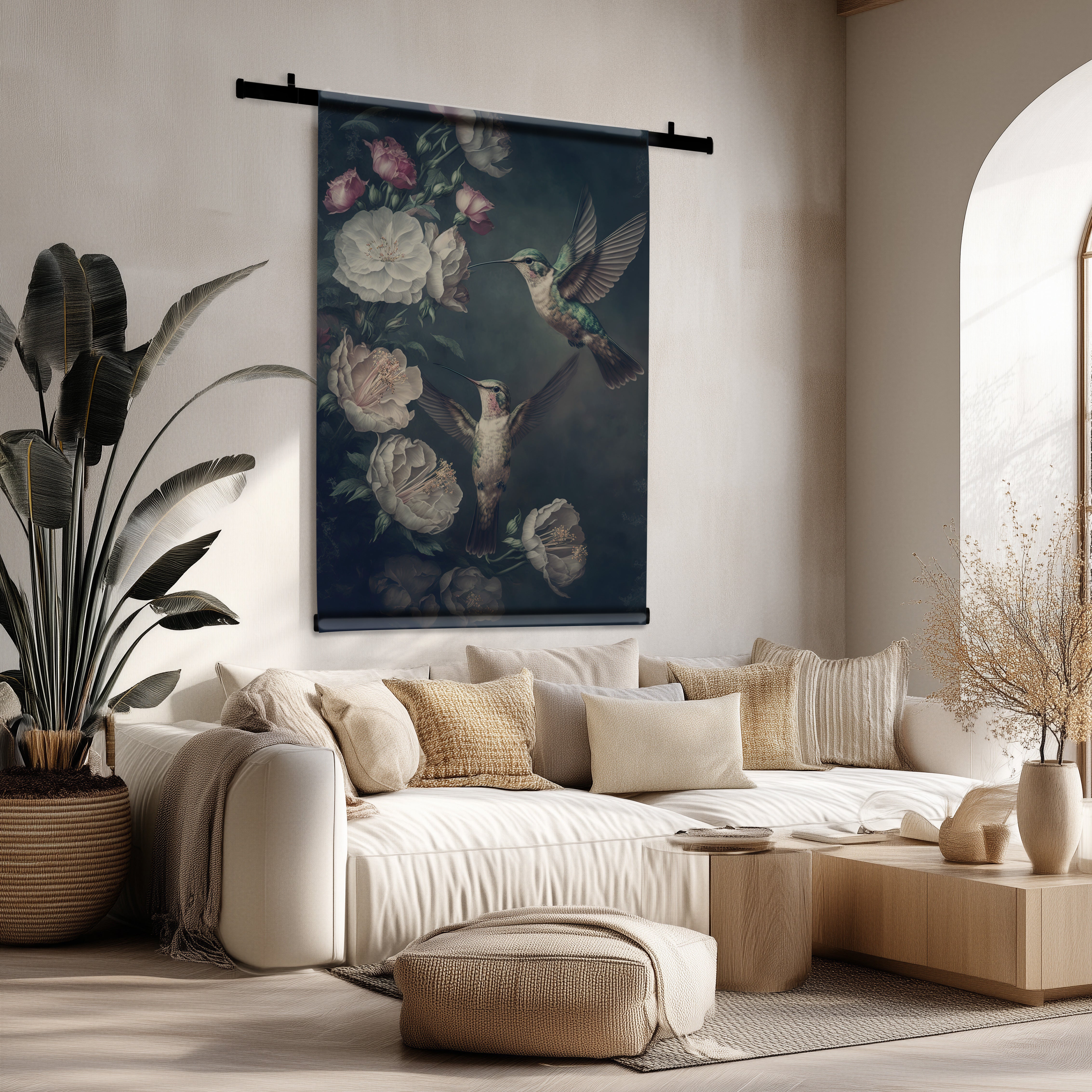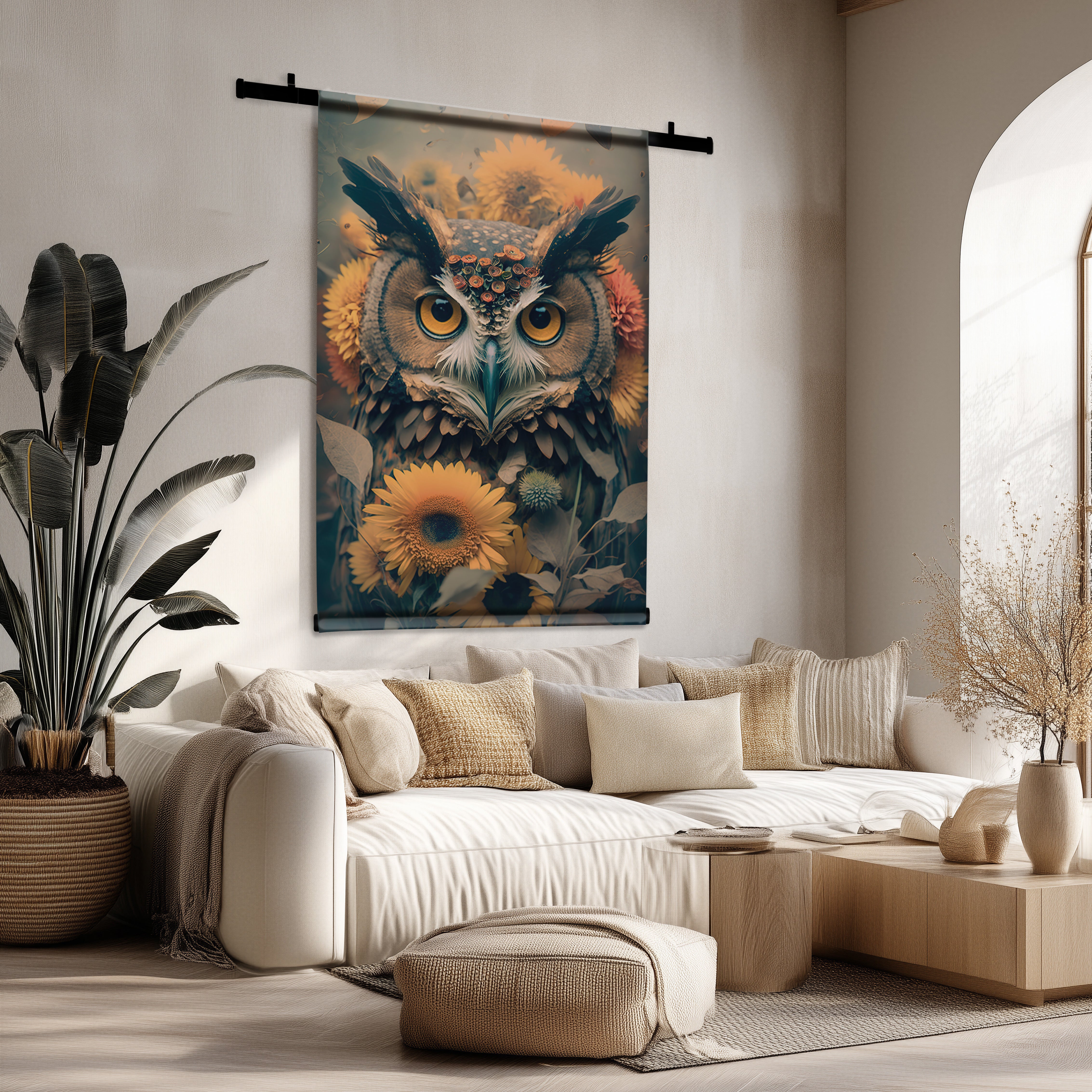 - In de woonkamer zorgen grote wandkleden voor een indrukwekkende eyecatcher.