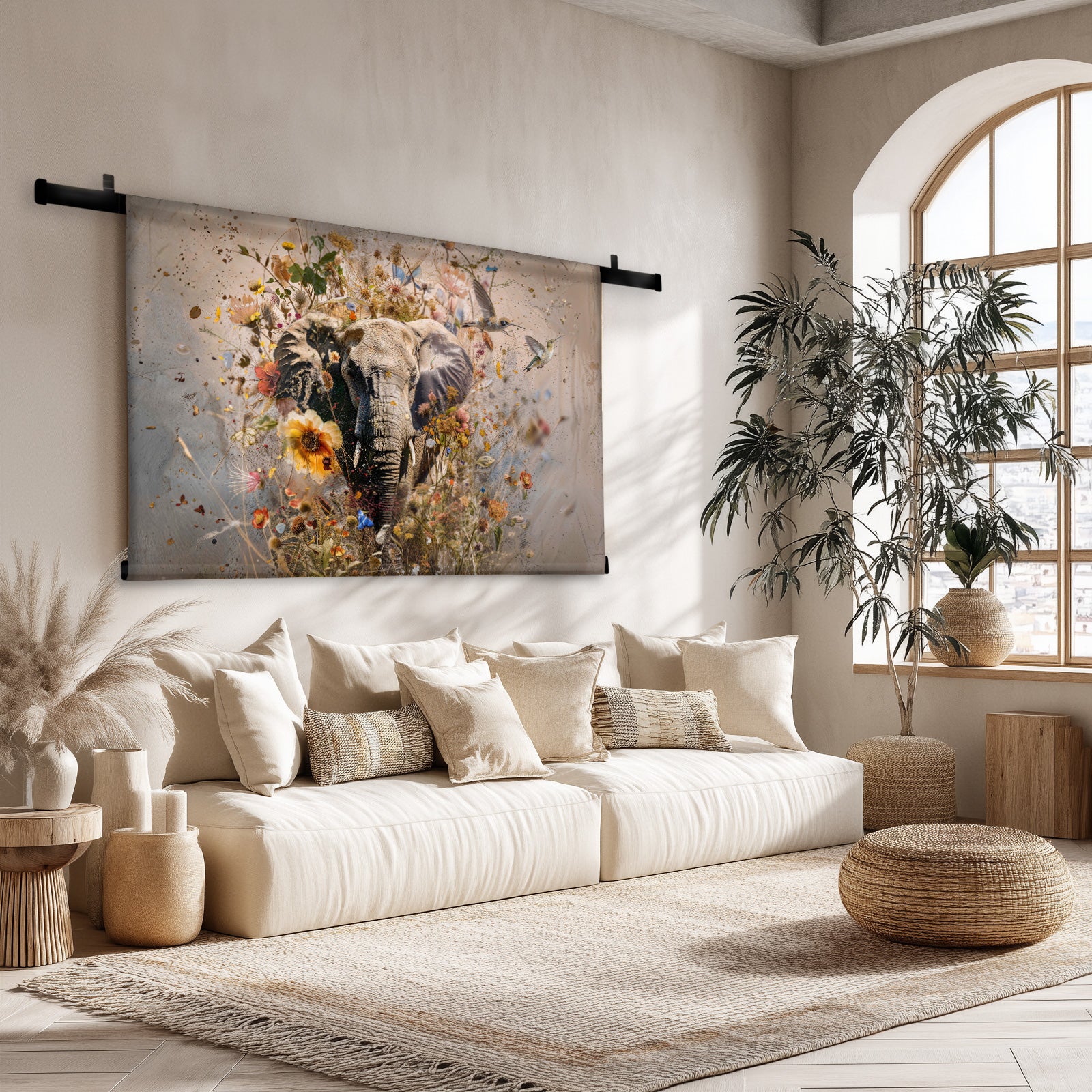 - In de woonkamer zorgen grote wandkleden voor een indrukwekkende eyecatcher.
