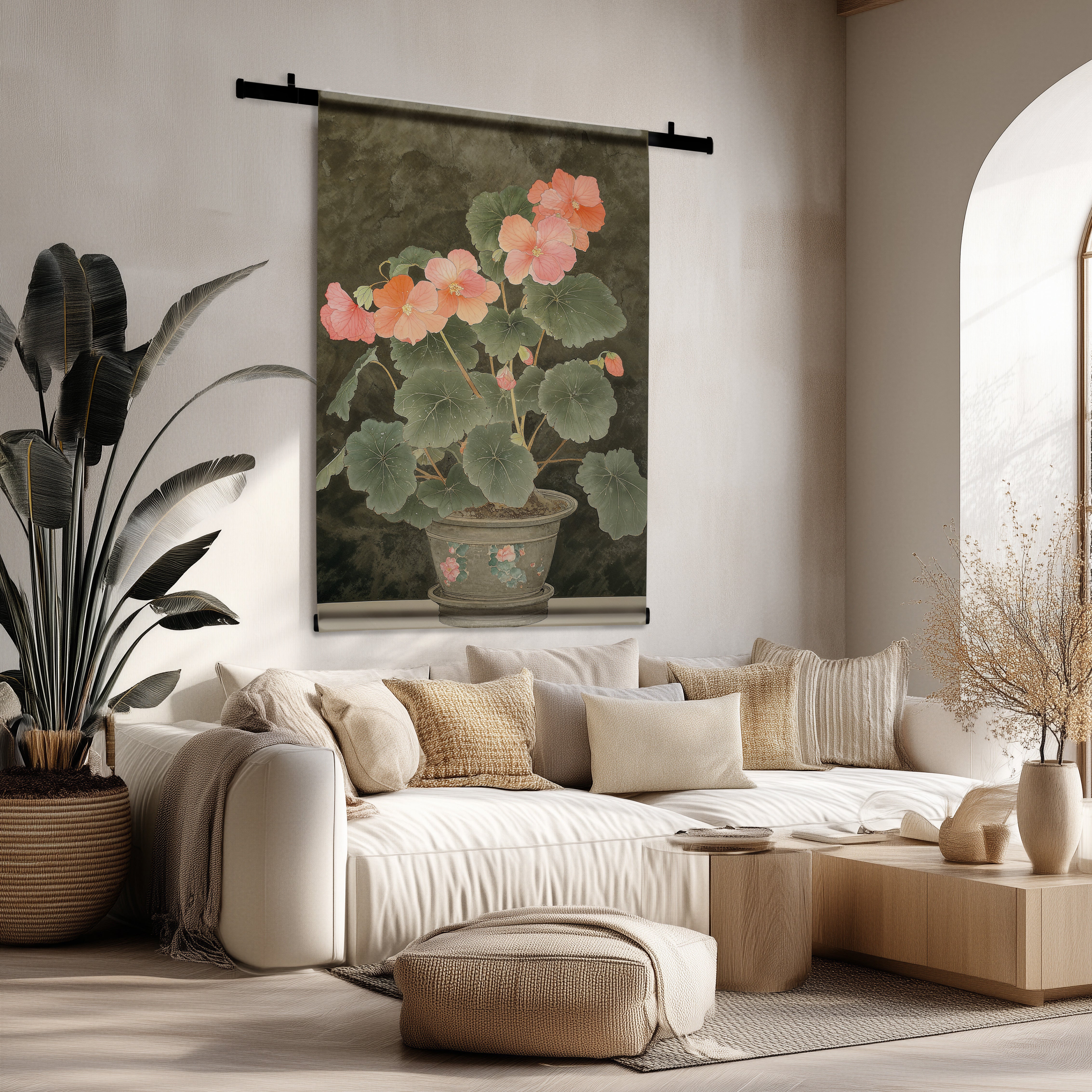 Begonia is een wandkleed dat een serene en natuurlijke sfeer brengt in je interieur. De zachte botanische bloemenprint zorgt voor een frisse, rustige uitstraling die elke ruimte versterkt.