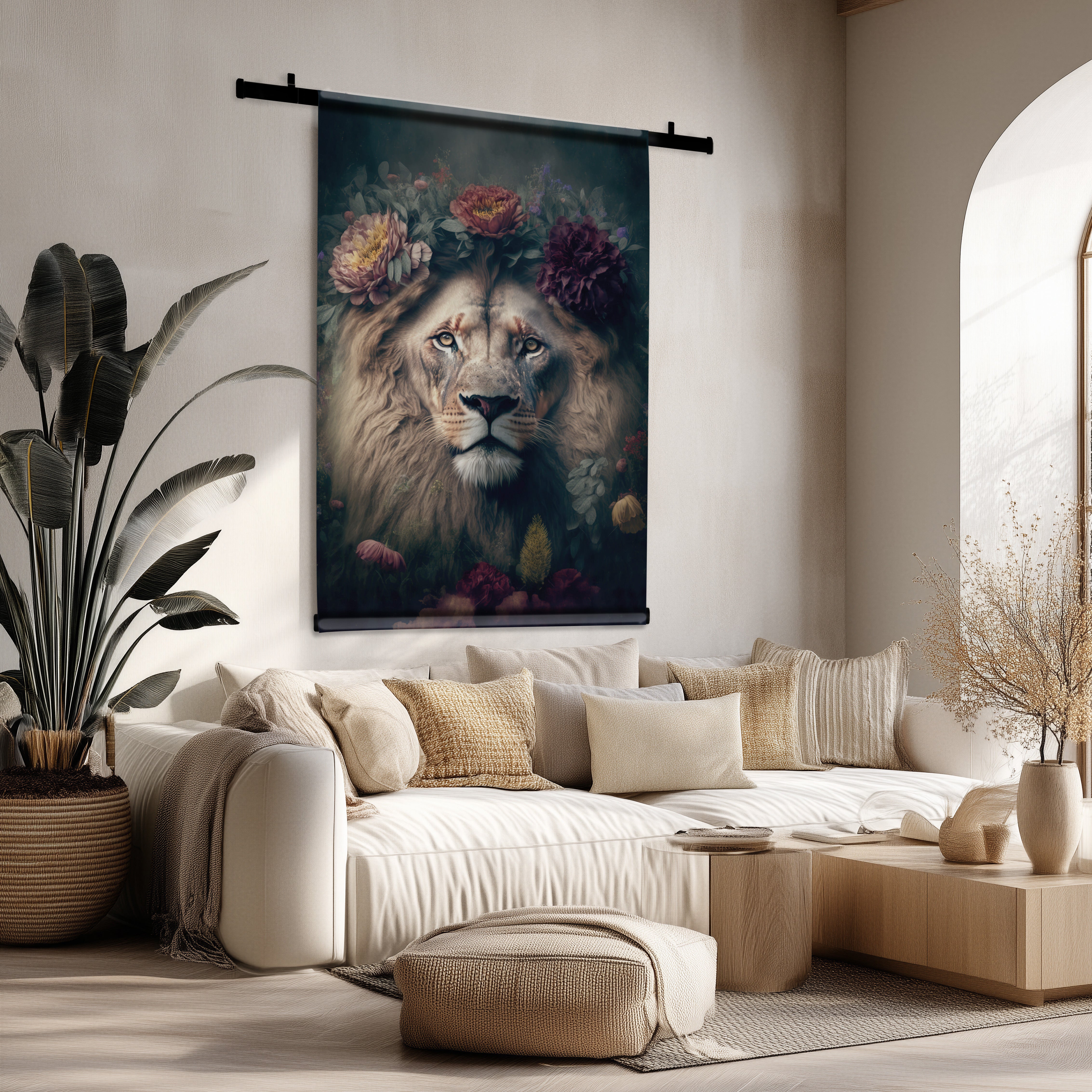 Laat je meevoeren door de krachtige uitstraling van de Lion 2 wandkleed, die direct een gevoel van rust en majestueuze energie in je interieur brengt. Dit stijlvol muuraccent geeft een warme en sfeervolle ambiance, perfect om thuis te ontspannen of te inspireren.