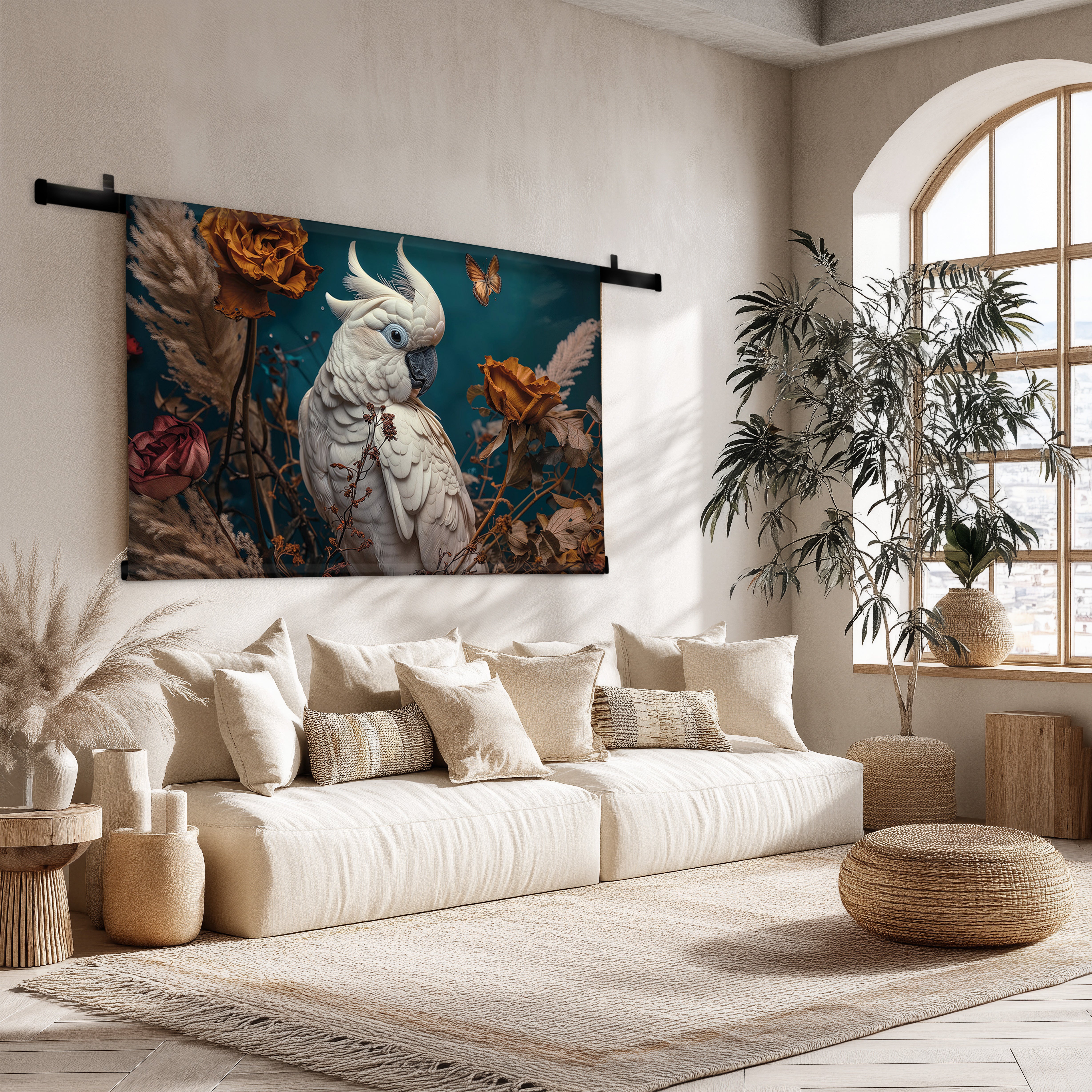 Dit stijlvolle wandkleed voegt direct sfeer toe aan je woonkamer, slaapkamer of werkplek dankzij het levendige ontwerp van de cockatoo en de rijke, natuurlijke kleuren. Je kunt kiezen uit Mezo, een robuuste matte stof met een natuurlijke uitstraling, of Velours, een luxe stof met een subtiele zijdeglans. Dit kunstwerk past perfect in woonstijlen zoals landelijk, bohemian, industrieel of zen/japandi/minimalistisch. Het functioneert als een uniek muuraccent dat elke ruimte een warme, rustgevende energie geeft.
