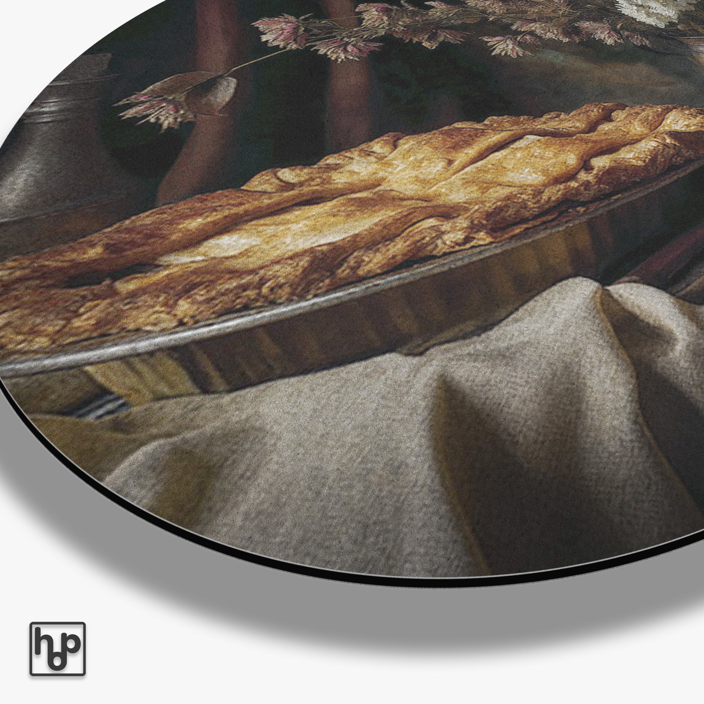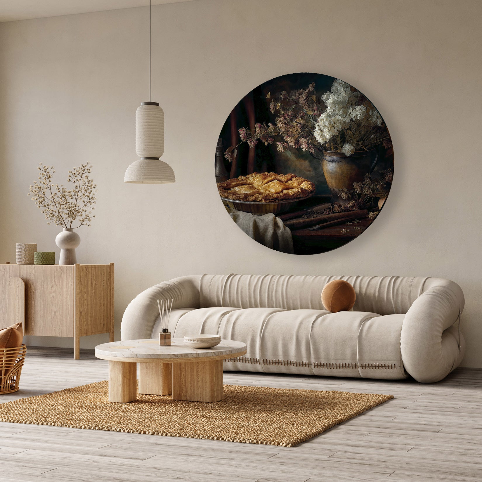 Deze muurcirkel van aluminium dibond, getiteld De appeltaart, roept een warme en nostalgische sfeer op. Het stilleven met de goudbruine appeltaart en het droogbloemenboeket past perfect in een gezellig interieur en brengt direct karakter in elke ruimte. Dit kunstwerk werkt als een subtiele blikvanger die sfeer en huiselijkheid toevoegt, ideaal voor de woonkamer, keuken of zelfs een gezellige hoek in de hal.