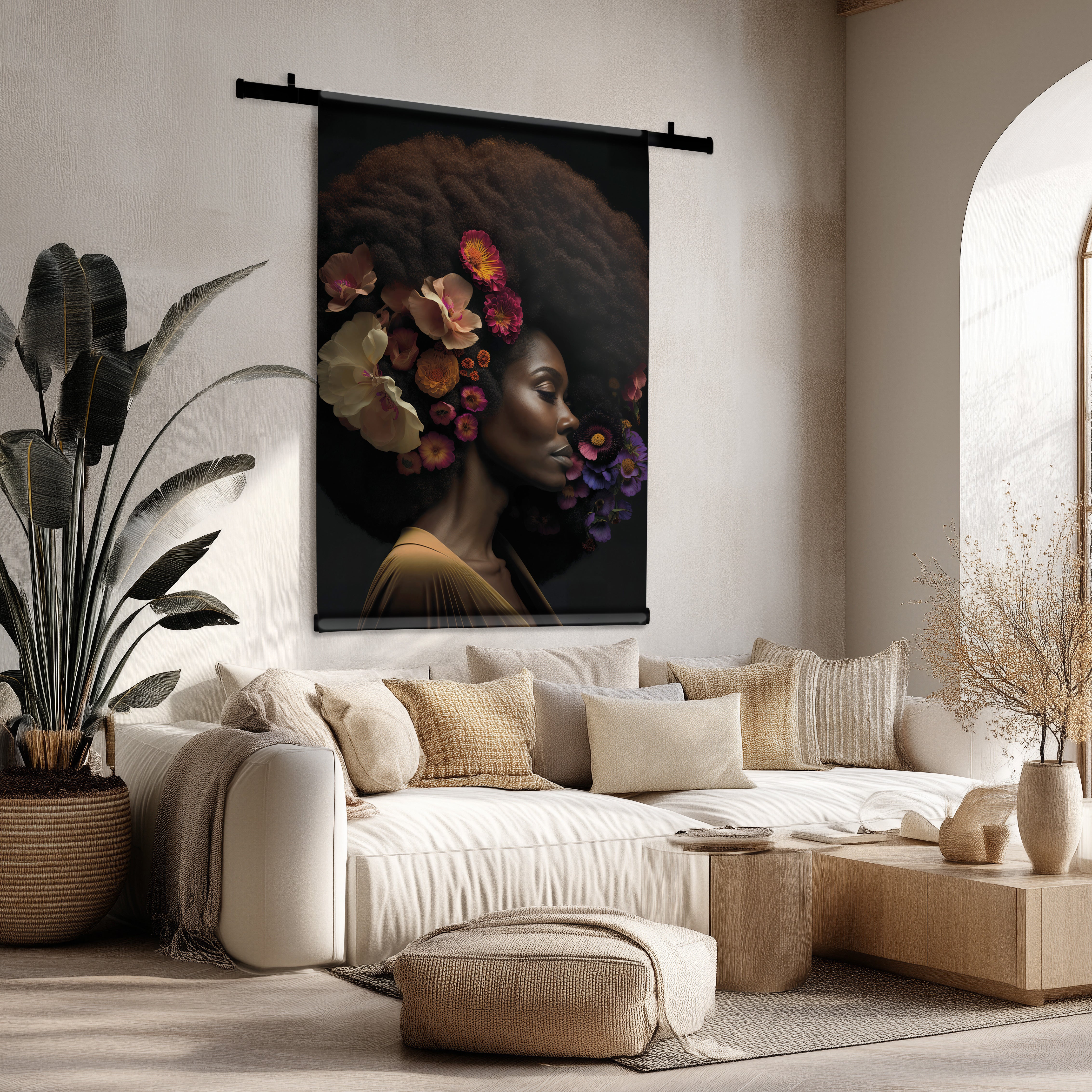 Breng een serene en elegante sfeer in huis met dit subtiele maar krachtige wandkleed. Het vrouwelijk portret, omlijst door een bloemenmotief, versterkt elke ruimte met een verfijnde en kalme uitstraling.