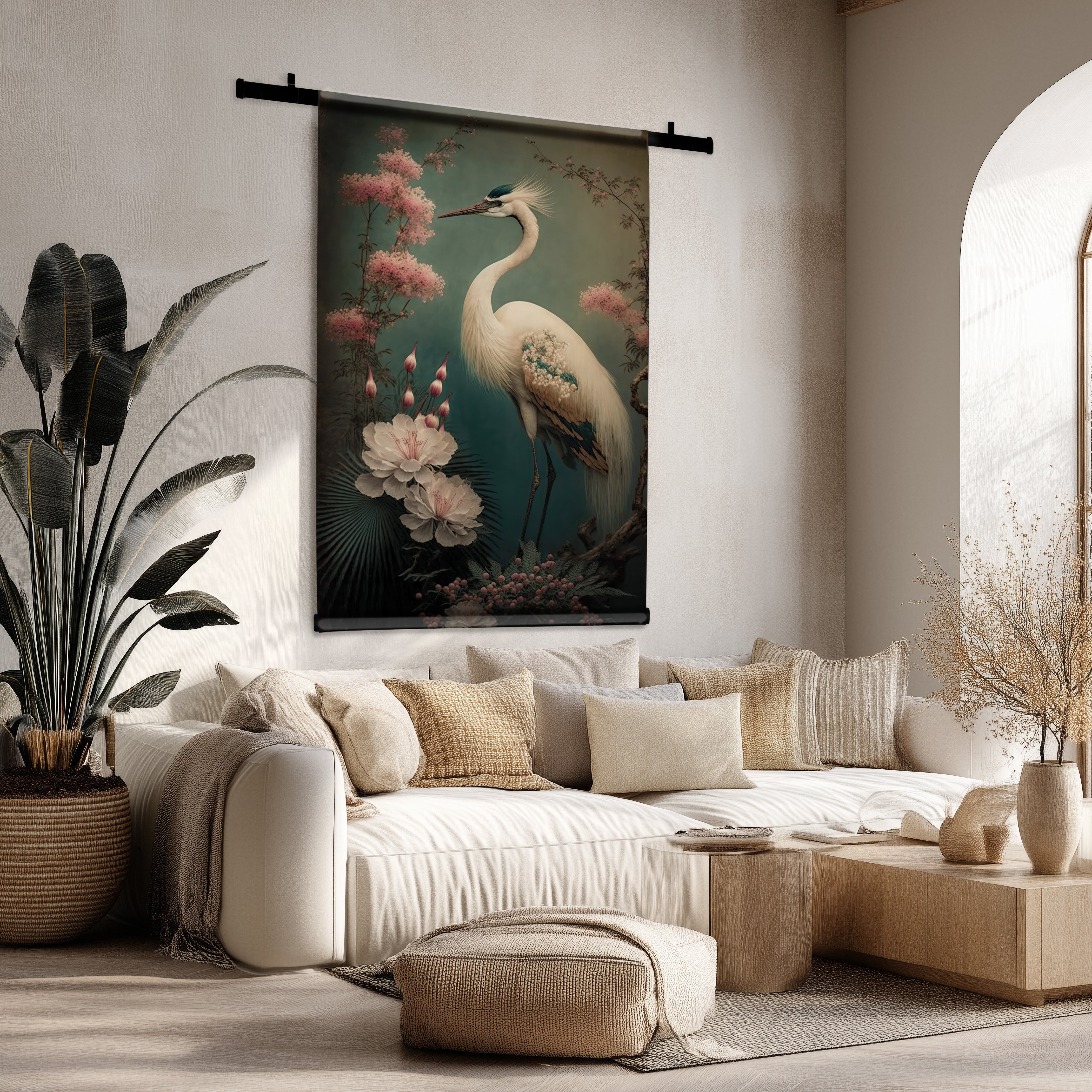 Ervaar de serene schoonheid van Oosterse natuurkracht in je interieur met dit Japanse kraanvogel wandkleed. Het subtiele samenspel van zachte bloemen en gracieuze kraanvogels brengt een kalme en elegante sfeer in elke ruimte, perfect om tot rust te komen na een drukke dag.