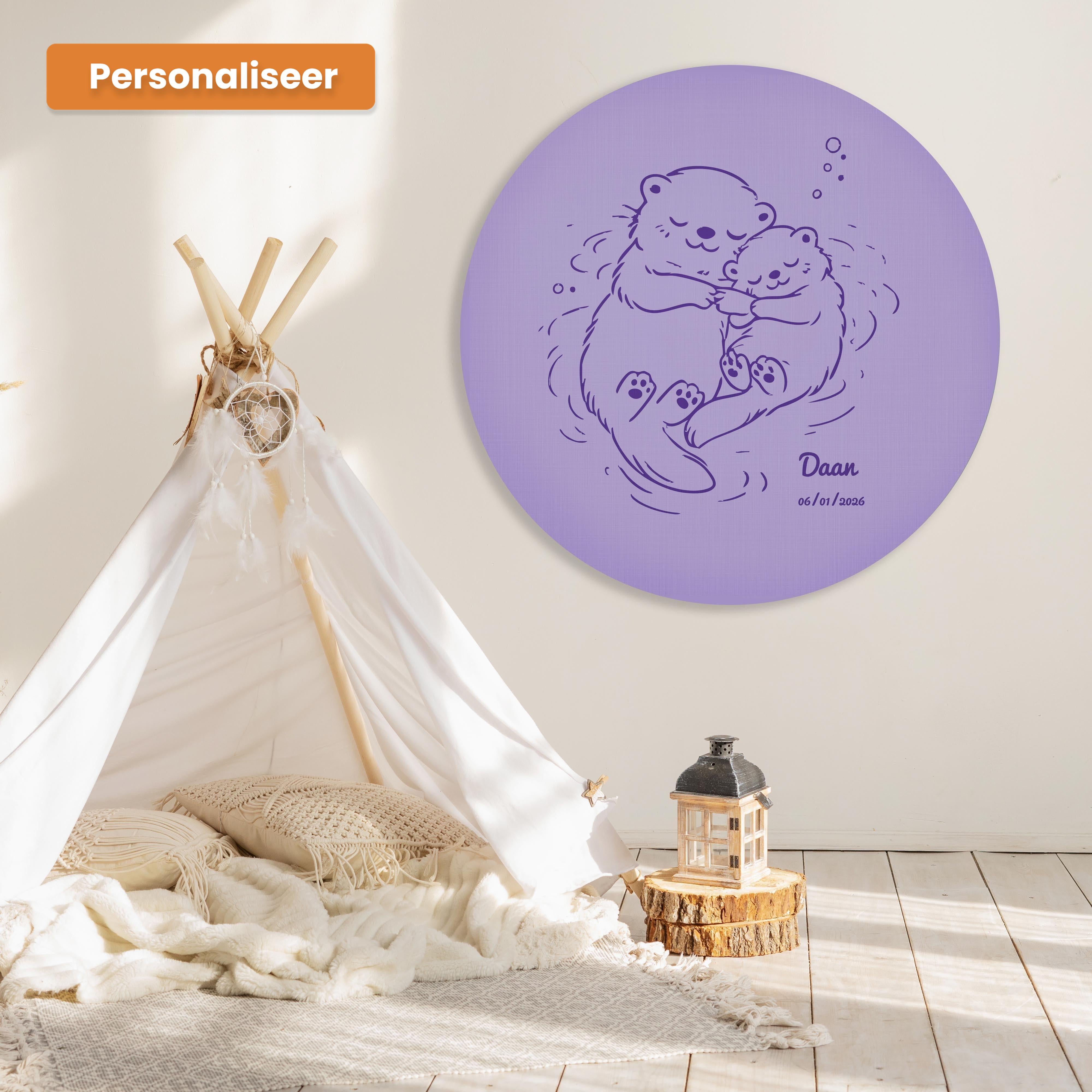 Deze personaliseerbare kunst voor de kinderkamer met het ontwerp Otters · Muurcirkel straalt een warme en liefdevolle sfeer uit. De twee knusse otters die elkaar in de armen sluiten zorgen voor een gevoel van rust en verbondenheid in de baby- of kinderkamer. Door de naam en geboortedatum toe te voegen, krijgt het kunstwerk een persoonlijke en liefdevolle uitstraling die het emotionele karakter van de ruimte versterkt.