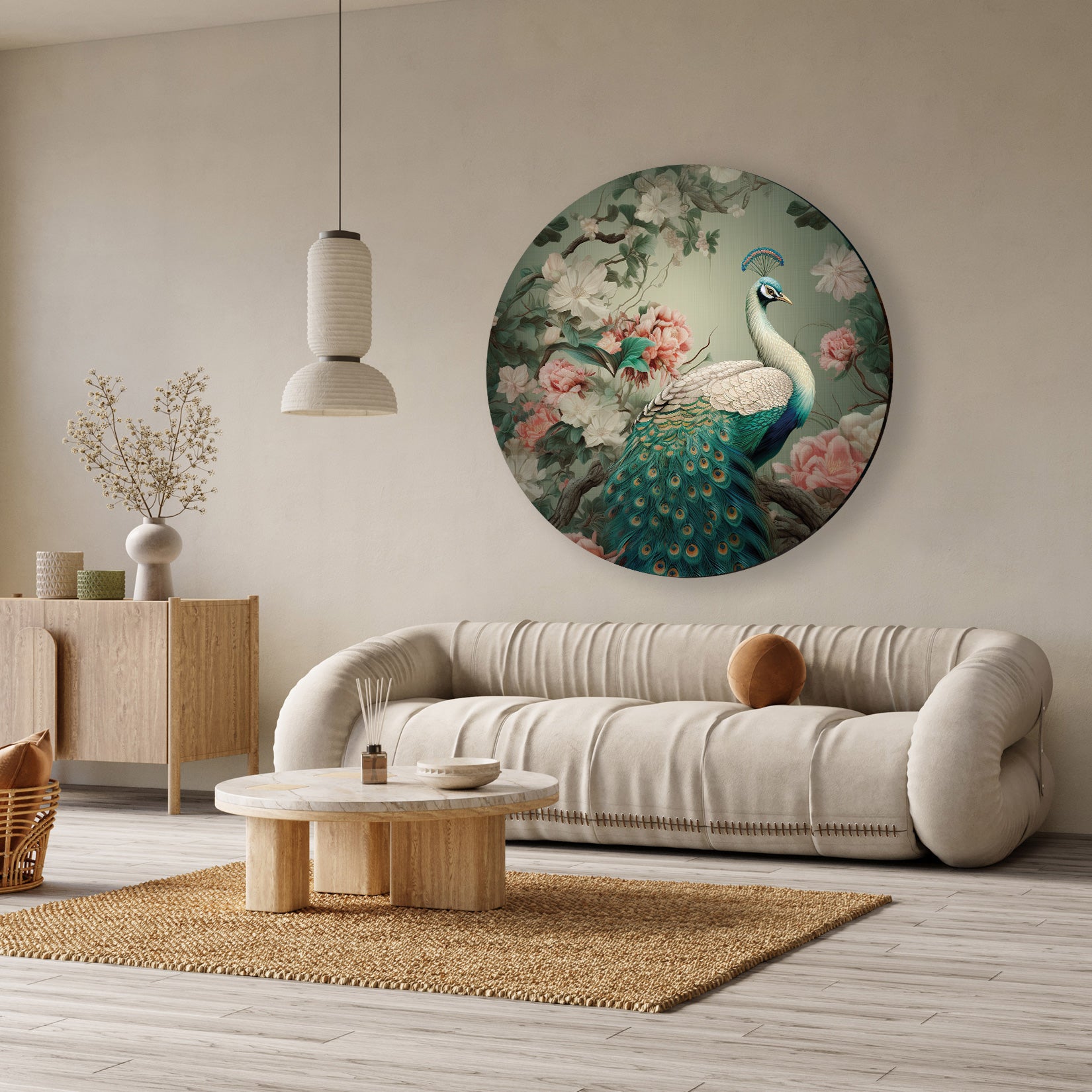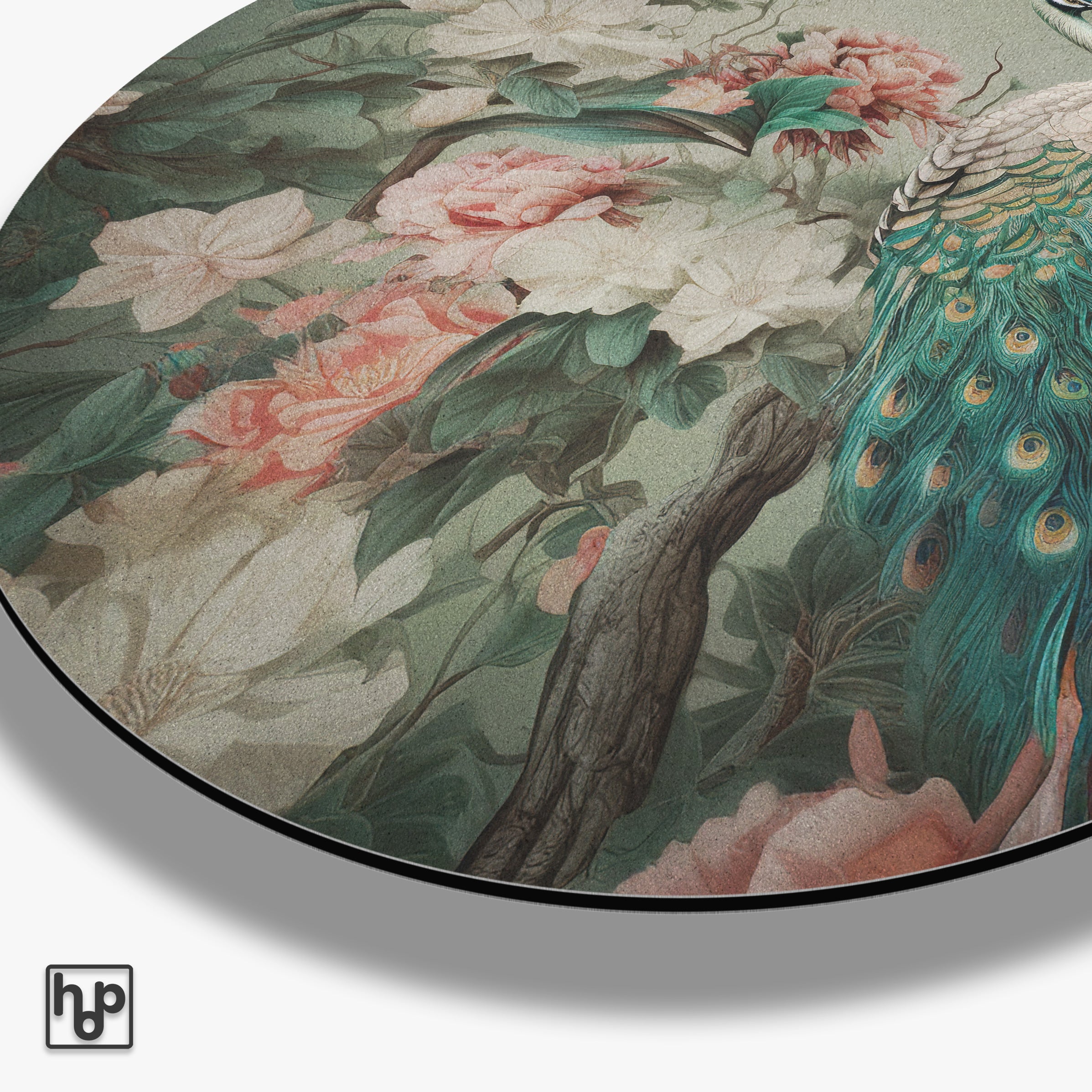 Deze muurcirkel van aluminium dibond straalt elegantie en verfijning uit door het prachtige ontwerp van een pauw te midden van weelderige bloemen. Het rustige kleurenpalet van zachtgroen, blauw en subtiele rozetinten brengt een natuurlijke, serene sfeer in jouw interieur. Deze aluminium wanddecoratie zorgt voor een stijlvol accent in bijvoorbeeld de woonkamer of slaapkamer, waar het de ruimte verrijkt met een artistiek en klassiek effect.