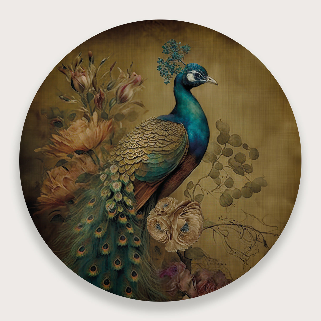 Deze muurcirkel van aluminium dibond met het ontwerp van een pauw straalt elegantie en verfijning uit. De rijke, natuurlijke kleuren in combinatie met het rustieke detail van de pauw zorgen voor een opvallend maar stijlvol kunstwerk. In een moderne woonkamer of een sfeervolle slaapkamer brengt deze aluminium wanddecoratie direct leven én karakter aan de muur. Dankzij het ronde formaat krijgt de ruimte een zachte, uitnodigende uitstraling die harmonie en balans creëert.