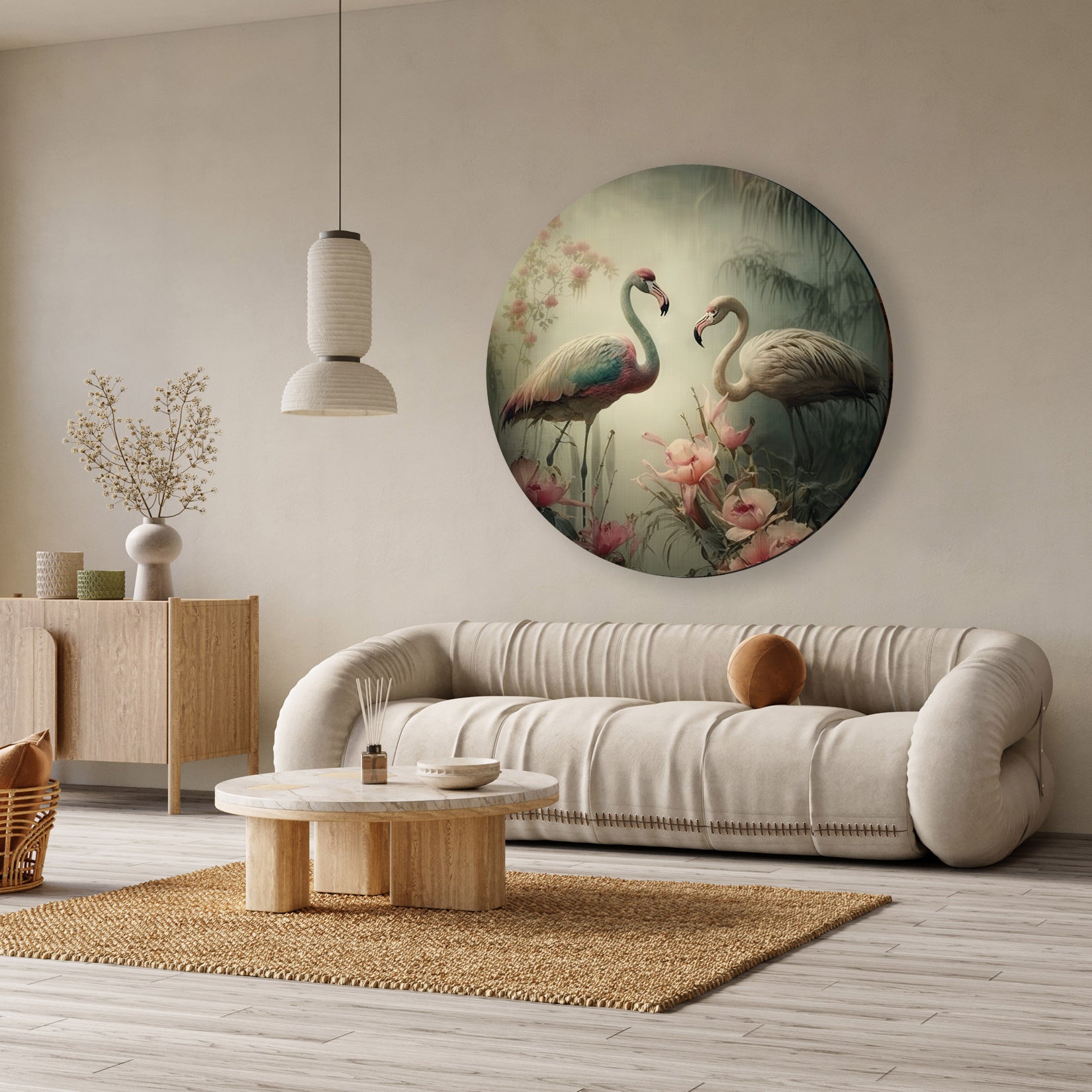 Deze muurcirkel toont een sfeervol ontwerp van twee flamingo's te midden van subtiele bloemen en natuurlijke tinten. Het rustige kleurenpalet met zachte rozetinten, groen en beige zorgt voor een harmonieuze en elegante uitstraling. Dit aluminium dibond schilderij past perfect in een moderne woonkamer of slaapkamer en geeft de ruimte een serene, stijlvolle sfeer zonder te overheersen.