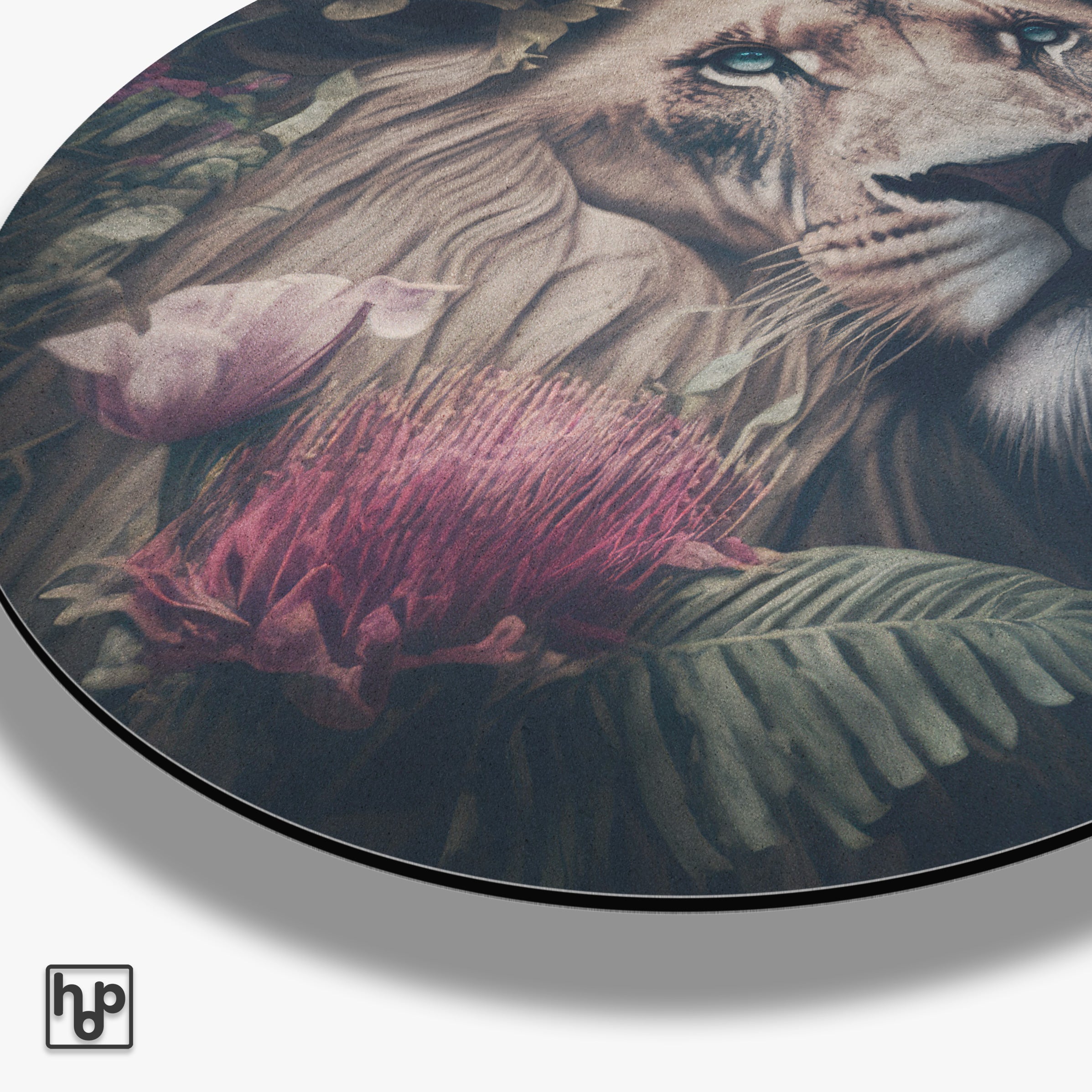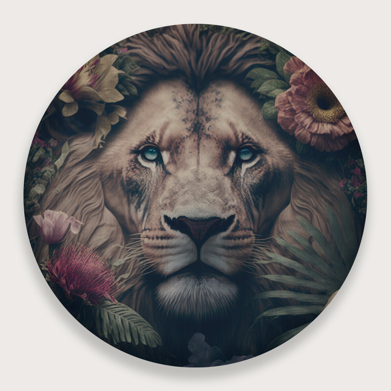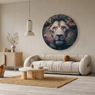 Deze muurcirkel van aluminium dibond toont een indrukwekkende leeuw met een mystieke uitstraling, omgeven door subtiele bloemen en bladeren. Dit kunstwerk voegt een krachtige en serene sfeer toe aan jouw interieur. Het gedetailleerde ontwerp komt perfect tot zijn recht in moderne woonkamers of stijlvolle kantoren, waar het de ruimte direct meer karakter en allure geeft.